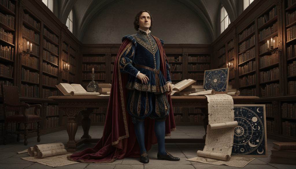 Giordano Bruno wurde am 1. Februar 1548 in Nola, einer Stadt in der Nähe von Neapel, geboren. Sein Vater war ein Soldat. Früh zeigte er eine außergewöhnliche Begabung und eine tiefe Leidenschaft für das Lernen. Mit nur 15 Jahren trat er in das Dominikanerkloster San Domenico Maggiore in Neapel ein und nahm den Ordensnamen Giordano an. Hier erhielt er eine umfassende theologische und philosophische Ausbildung, doch schon bald zeigten sich seine kritische Haltung und seine Neigung, etablierte Lehrmeinungen zu hinterfragen. Seine Liebe zur Lektüre, insbesondere von Werken wie den Schriften von Cicero und Plutarch, sowie seine intensive Auseinandersetzung mit der Hermetik und der neuplatonischen Philosophie, beeinflussten seine Denkweise maßgeblich.