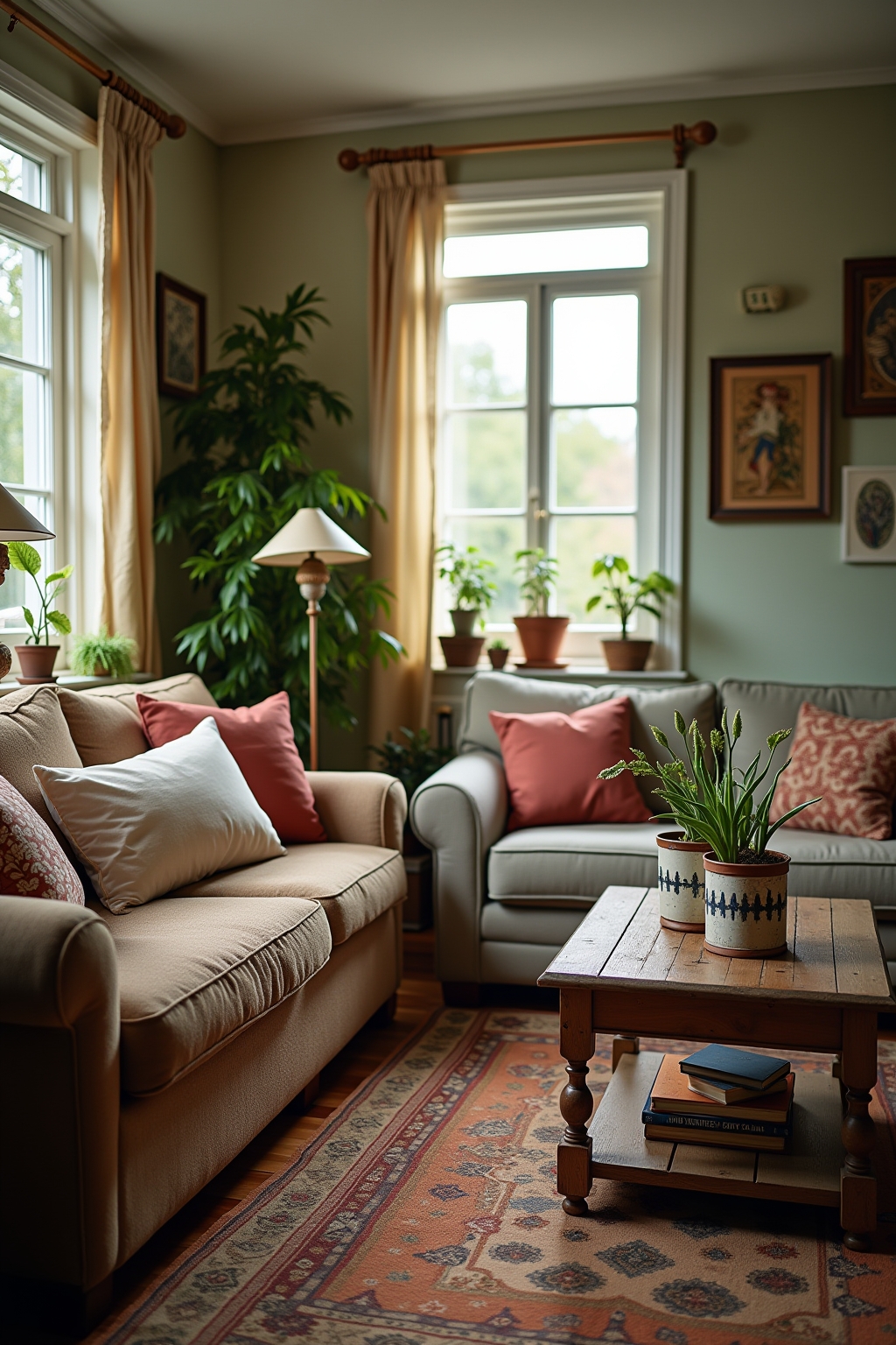 • Layered textiles including throws, pillows, and area rugs for warmth