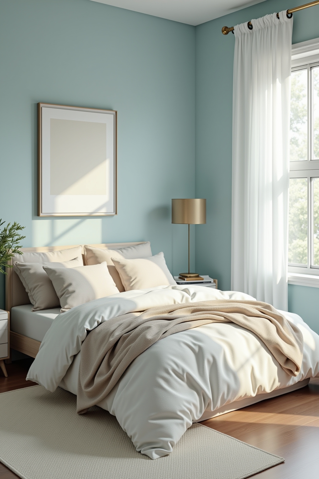 10. Puderblaue Wände mit cremefarbenen Textilien und naturfarbenen Accessoires für einen frischen, zeitgemäßen Look