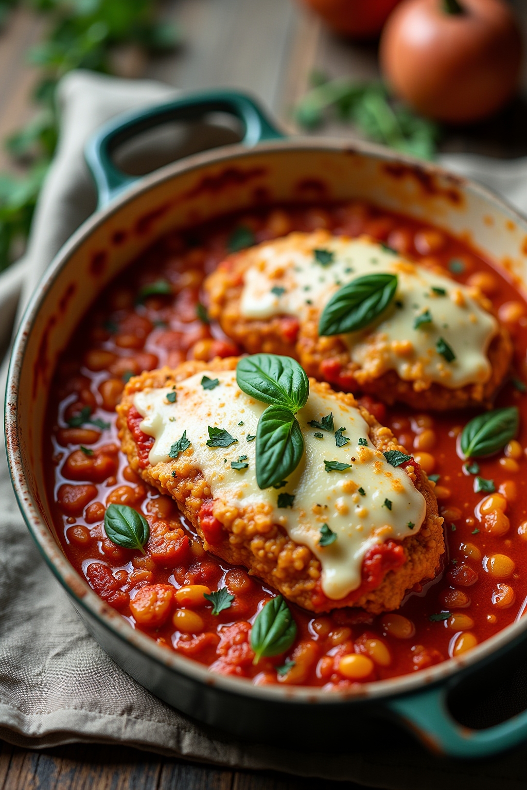 Craving a healthier version of your favorite Italian comfort food? This Gluten-Free Quinoa Chicken Parmesan Bake delivers all the cheesy, tomatoey goodness you love without the gluten – perfect for those with sensitivities or anyone looking to add more nutrition to their weeknight meals. You’ll be amazed at how quinoa creates the perfect base, soaking up all the delicious flavors while adding protein and fiber that traditional pasta just can’t match. Simply layer pre-cooked quinoa with seasoned chicken breasts, your favorite marinara sauce, and a generous helping of mozzarella and parmesan cheeses for an incredibly satisfying one-dish meal. This nutritious twist on classic chicken parm requires minimal prep time, making it ideal for busy weeknights when you need dinner on the table fast. While it bakes to bubbly perfection, you’ll have time to toss together a quick salad or steam some vegetables for a complete meal. Your family won’t even miss the breadcrumbs or pasta when they taste this protein-packed, gluten-free alternative that’s just as comforting as the original.