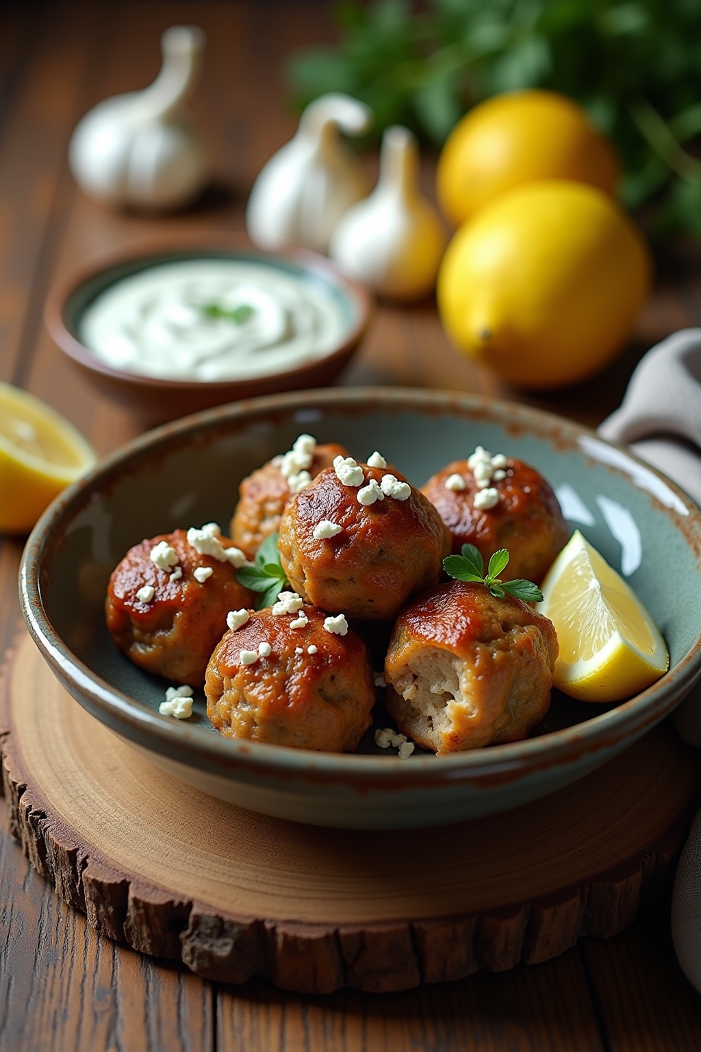 Lemon Garlic Turkey Feta Meatballs with Tzatziki