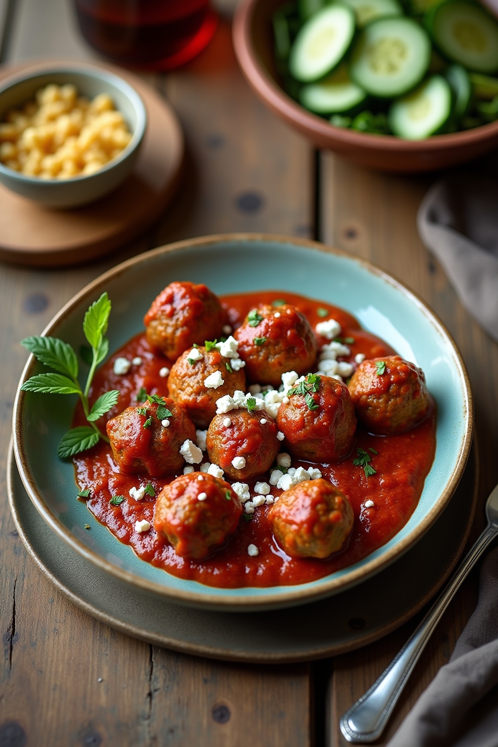 Spicy Harissa Turkey Feta Meatballs with Cucumber Salad