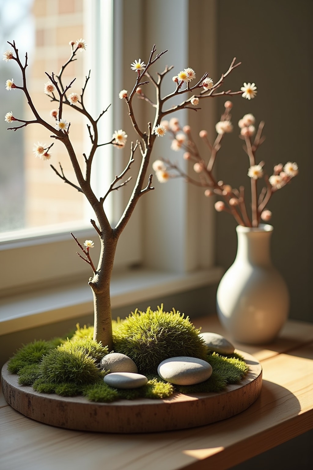 11. Natürliches Tischgesteck mit Zweigen, Moos und Frühlingsblumen