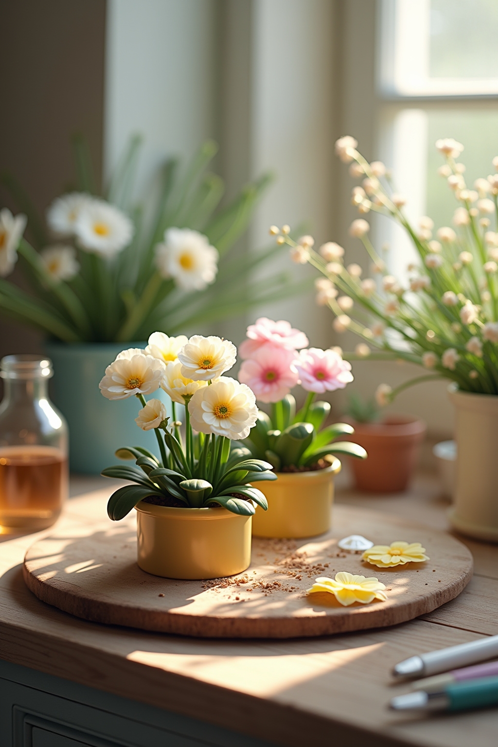 3. Gestalte ein Fensterbrett-Arrangement mit Primeln in verschiedenen Pastelltönen in schlichten Tontöpfen