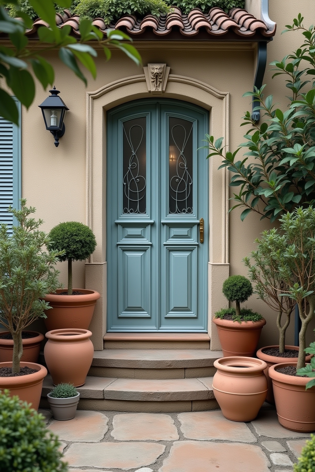 2. Sommer: Integriere mediterrane Terrakotta-Gefäße mit üppigen Blüten und dekorative Wasserspiele für Frische