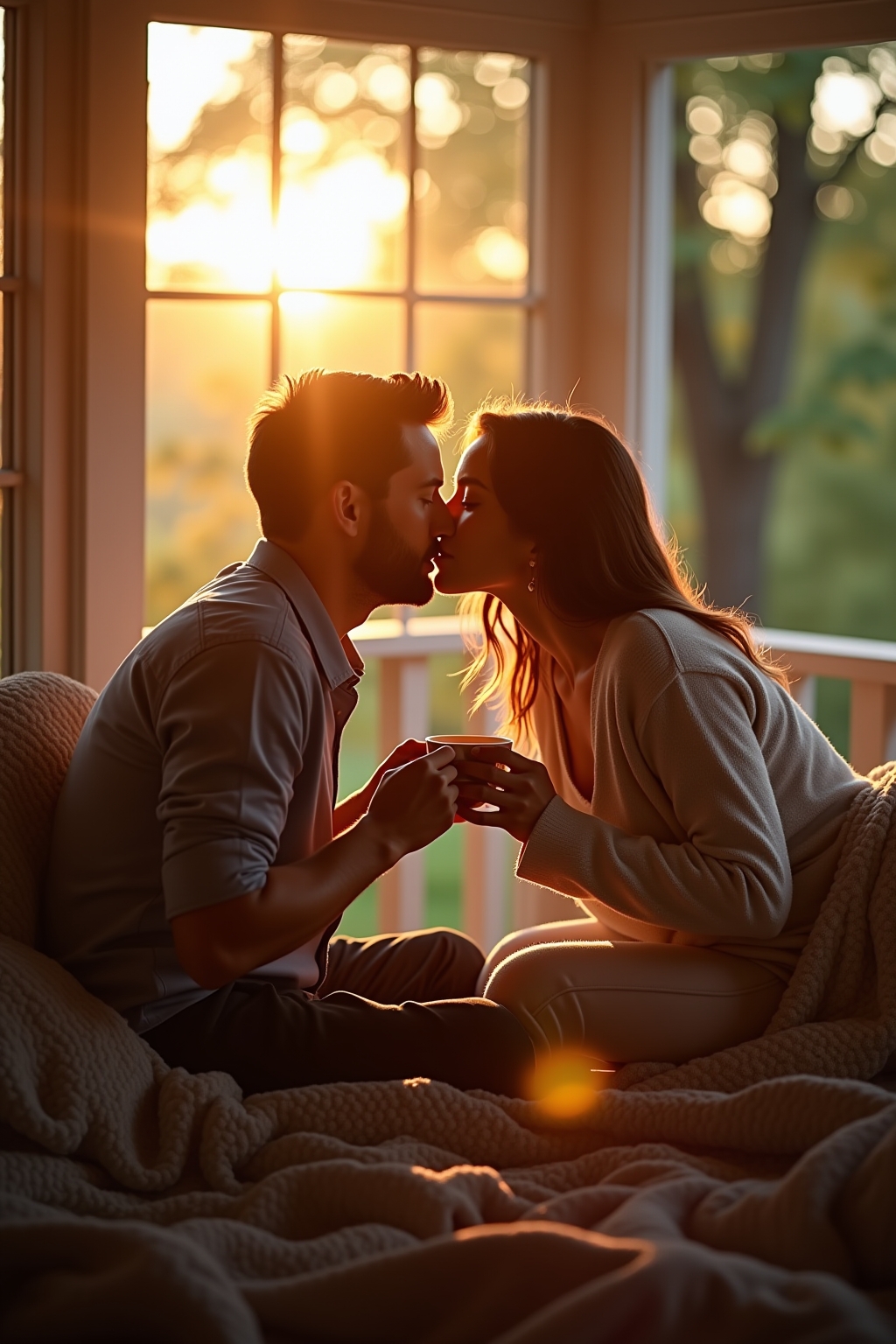 2. Steaming coffee cups with morning sunlight streaming through windows