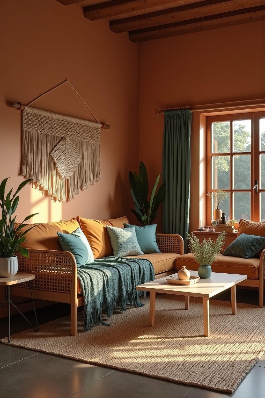 – Rich earthy tones including terracotta, rust, and ochre for grounding the space