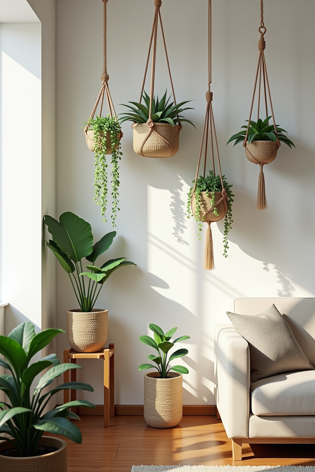 1. Incorporate macramé wall hangings or plant holders for texture without taking up valuable surface space