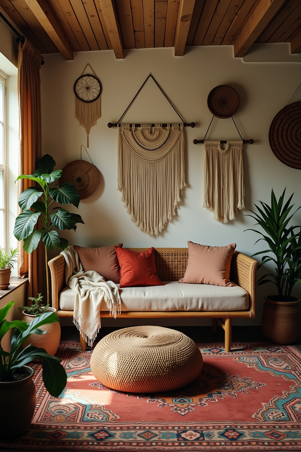 6. Global-inspired accessories including Moroccan poufs and Indian tapestries