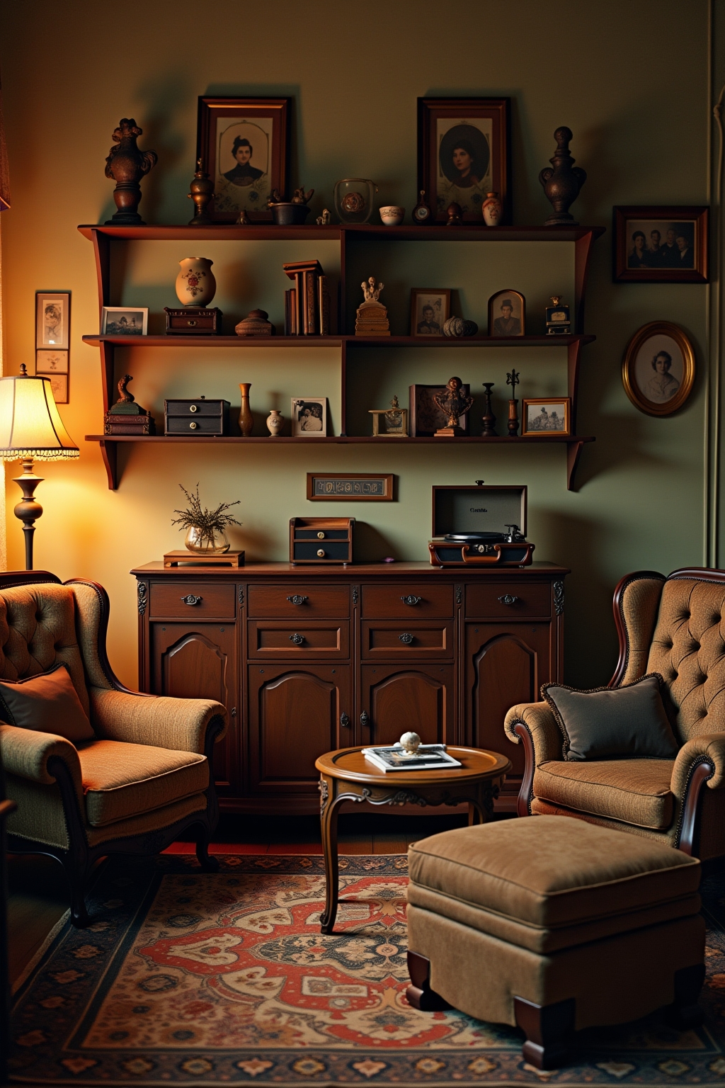 1. Living Room: Velvet tufted sofas, brass floor lamps, and vintage record players