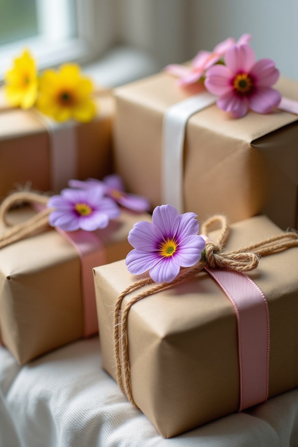 ## Mit Primeln dekorierte Geschenkverpackungen
