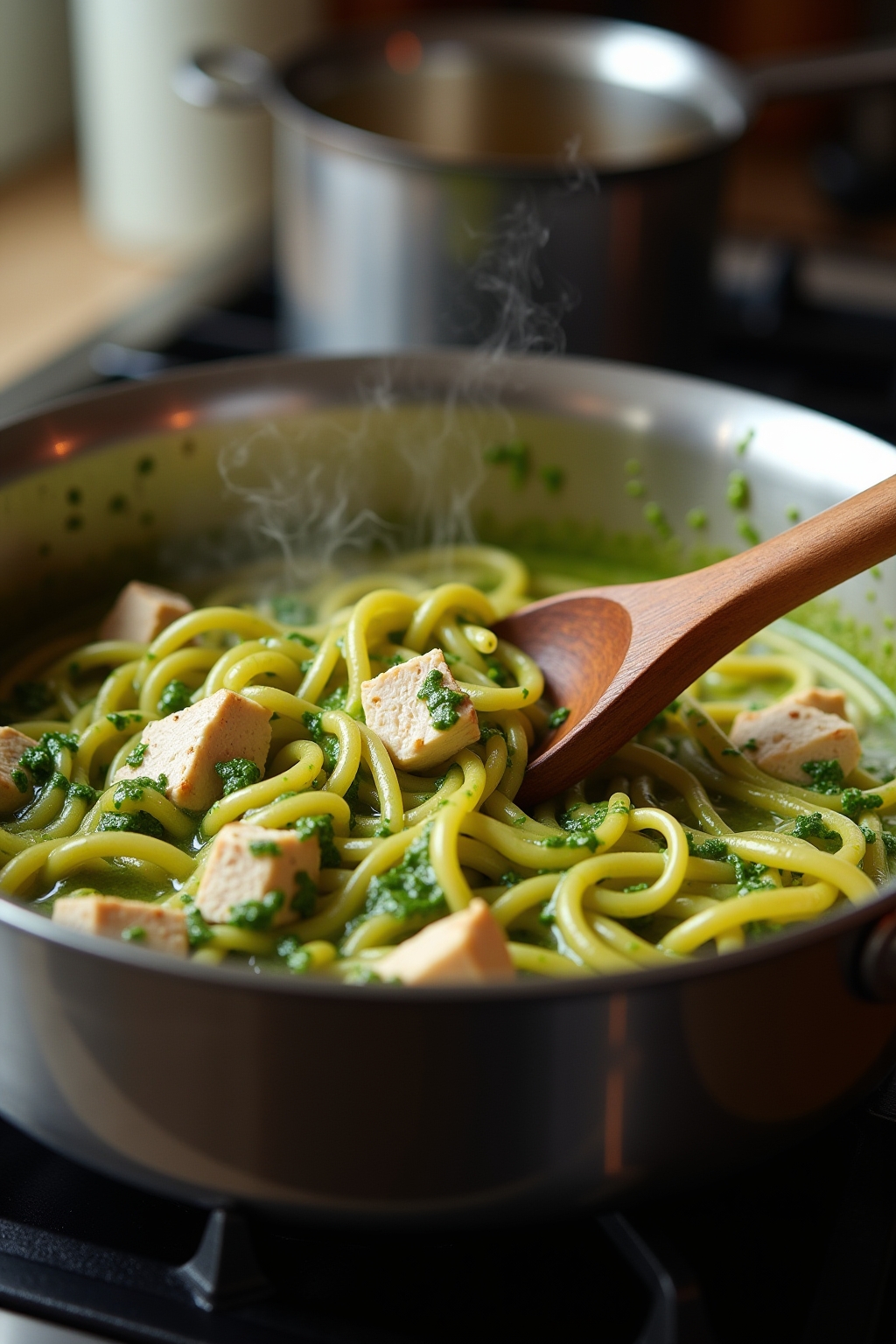 Craving a delicious, restaurant-quality dinner but short on time and energy? Our One-Pot Pesto Chicken Pasta is the ultimate solution for busy weeknights when you need a satisfying meal without the cleanup headache. This time-saving recipe combines tender chunks of chicken, al dente pasta, and vibrant homemade or store-bought pesto into one harmonious dish that cooks in just 30 minutes. You’ll appreciate how the starchy pasta water creates a silky sauce that clings perfectly to every piece of pasta and chicken. The beauty of this pesto chicken pasta lies in its simplicity—just toss everything into a single pot and let the ingredients work their magic together while you tackle other evening responsibilities. Kids and adults alike will devour this crowd-pleasing meal that delivers fresh Italian flavors without hours of kitchen labor. Plus, you can easily customize it with whatever vegetables you have on hand, making it a versatile addition to your weeknight dinner rotation.