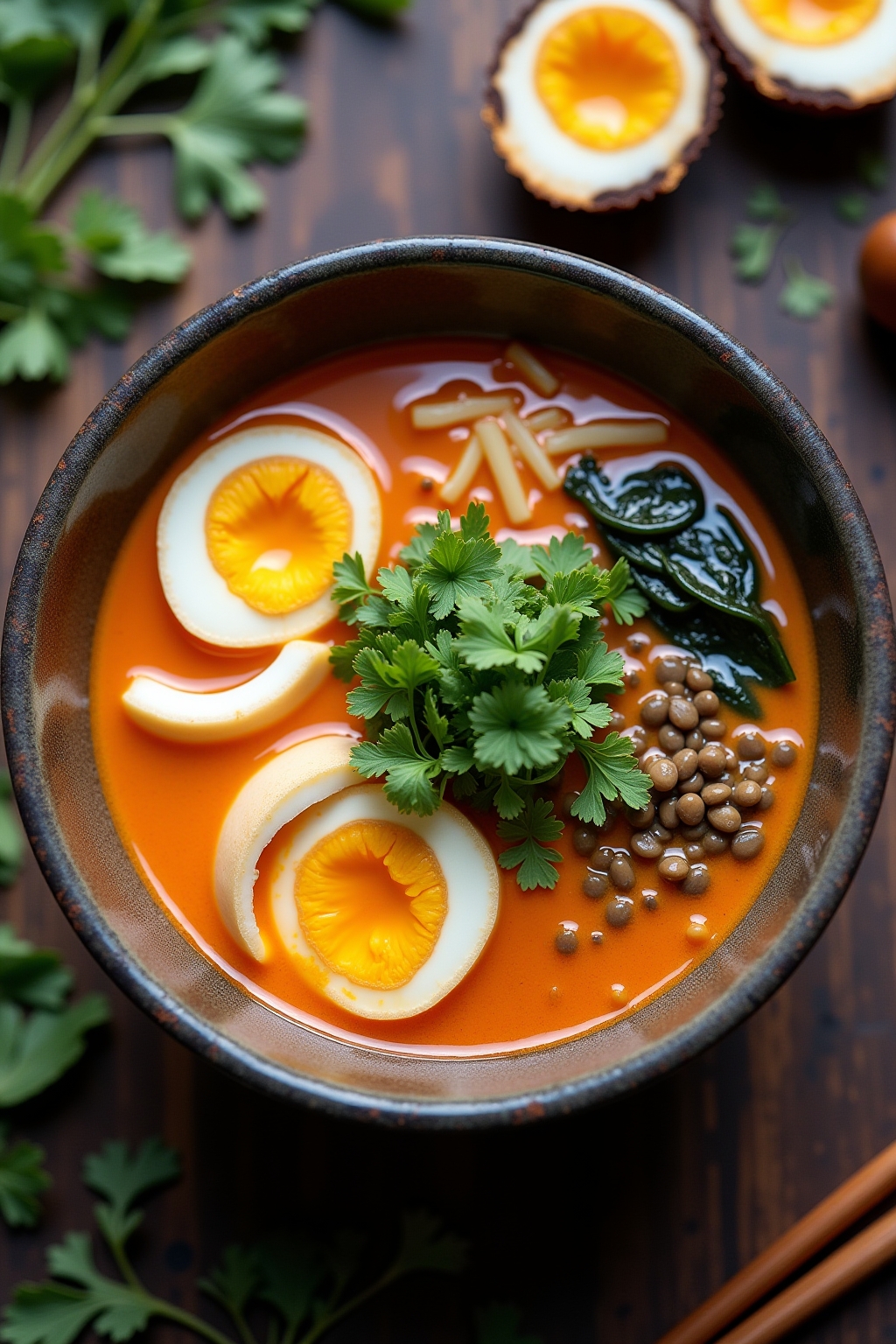 – Miso Ramen with Tea-Stained Eggs: Marinated soft-boiled eggs with miso broth