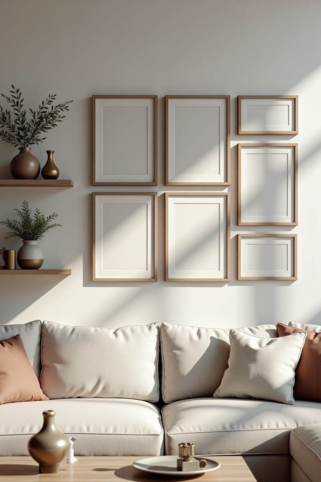 – Gallery Wall mit unterschiedlichen Rahmengrößen, aber einheitlicher Farbgebung