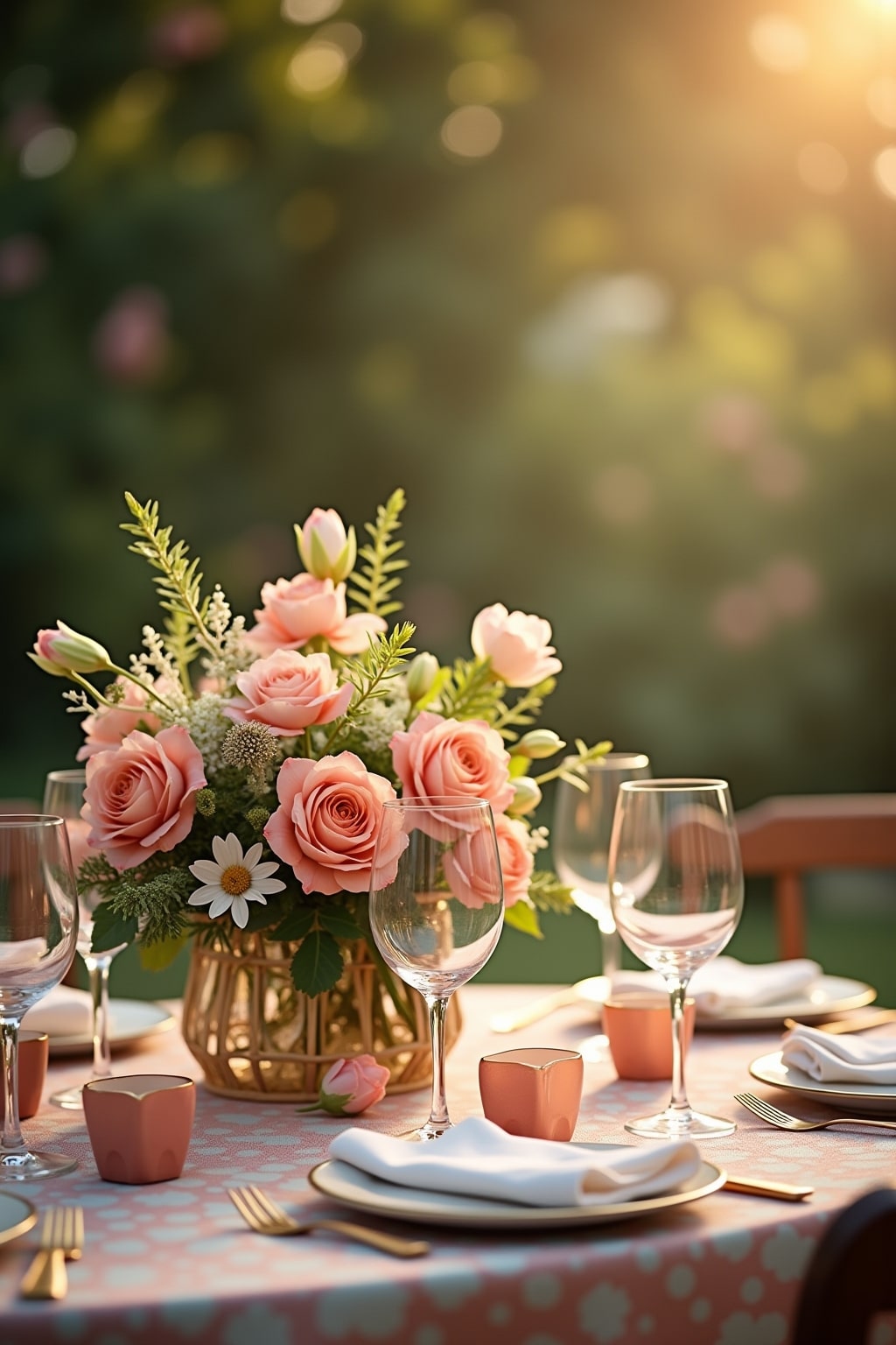 – Pastellrosa Primeln mit zartblauem Porzellan und silbernen Accessoires