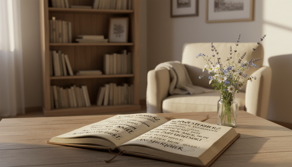 | Dankbarkeit und Wertschätzung | Ausdruck von Anerkennung für die Anwesenheit, Unterstützung und Liebe einer Schwester. | „Danke, dass du du bist.“; „Du machst jeden Tag heller.“ |