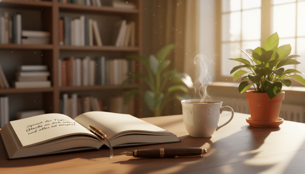Du kannst dir tägliche Erinnerungen auf deinem Smartphone einstellen, deine Lieblingssprüche als Hintergrundbild verwenden oder sie an Orten platzieren, an denen du sie oft siehst, wie z.B. am Spiegel oder an deinem Schreibtisch. Das Führen eines Motivationsjournals, in dem du tägliche Sprüche notierst und reflektierst, kann ebenfalls sehr hilfreich sein.