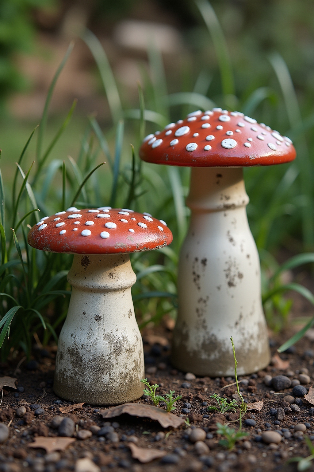 Vintage Beton Pilze als funktionale Hocker und Blickfang im naturnahen Garten