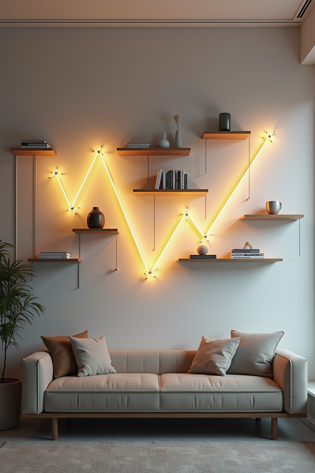 2. Schwebende Regalsysteme mit integrierten LED-Leuchten für atmosphärische Lichtakzente