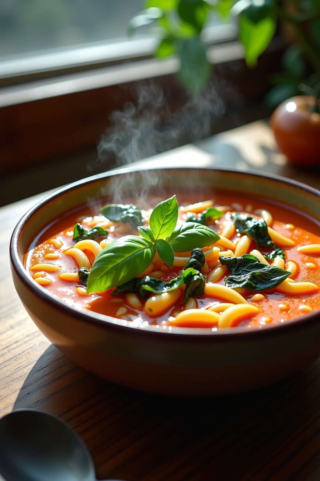 Vegan Coconut Tomato Orzo Soup with Basil and Spinach