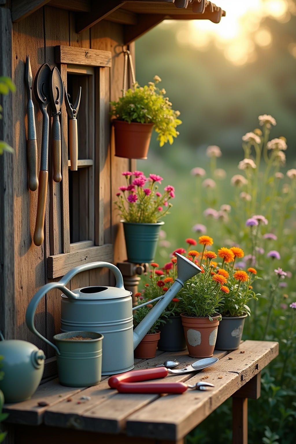 – Antike Gartengeräte wie Gießkannen oder Rechen als Wanddekoration