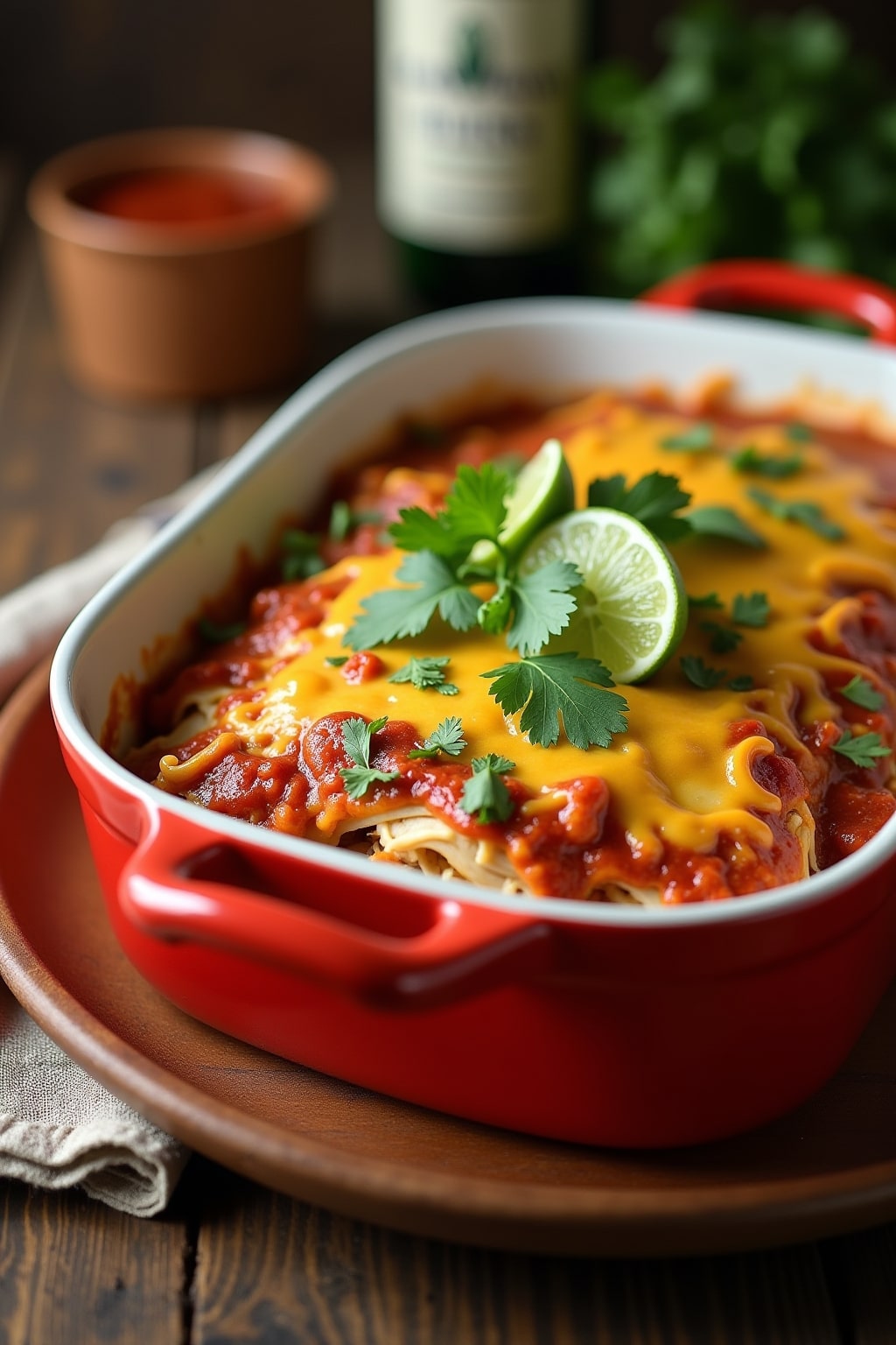 Hey there, ready to spice up your weeknight dinner routine with a crowd-pleasing favorite? This Mexican-Inspired Chicken Enchilada Casserole brings all the flavors you love about traditional enchiladas but in a convenient, layered casserole form that’s perfect for feeding a hungry family. You’ll love how the tender shredded chicken mingles with the rich enchilada sauce, creating pockets of flavor in every bite. The beauty of this dish is how customizable it is—you can adjust the heat level by choosing mild, medium, or hot enchilada sauce depending on your family’s preference. When those layers of tortillas bake up with the melty cheese on top, you’ll get that perfect crispy-edged, gooey-centered texture that makes casseroles so irresistible. Best of all, this casserole can be prepped ahead and even frozen, making it a fantastic option for busy weeknights or potlucks. Trust me, once you try this Mexican-inspired twist on chicken casserole, it’ll quickly become a regular in your dinner rotation!