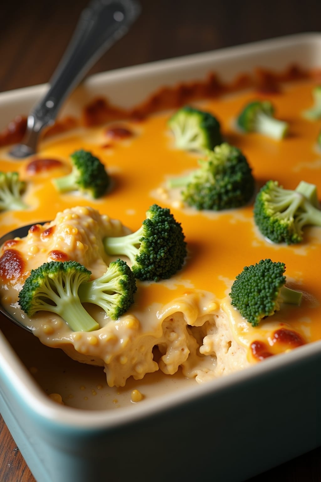 • Creamy Chicken and Rice Casserole with broccoli and cheddar cheese