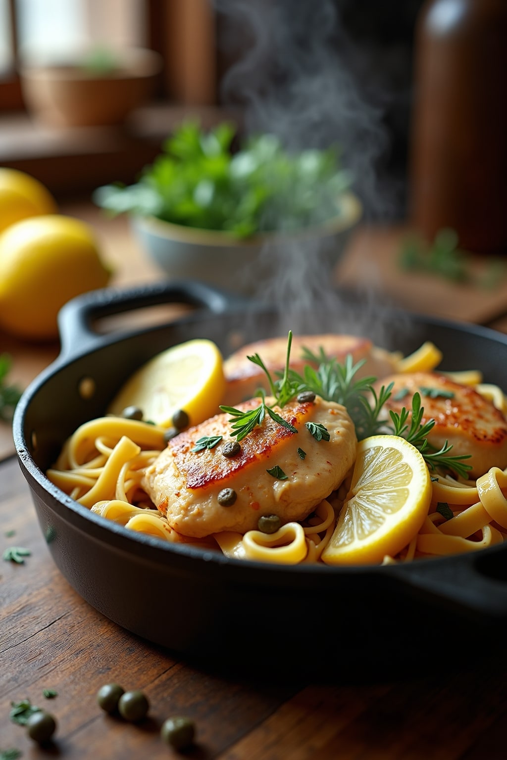 • Add fresh lemon juice, chicken broth, and capers to create the signature sauce