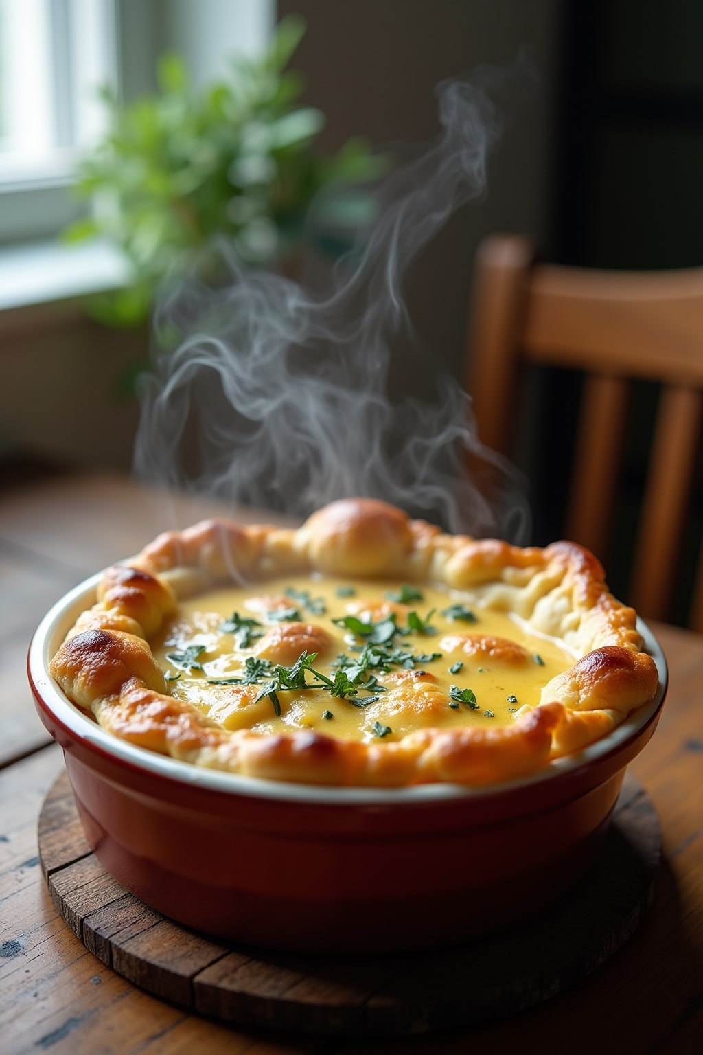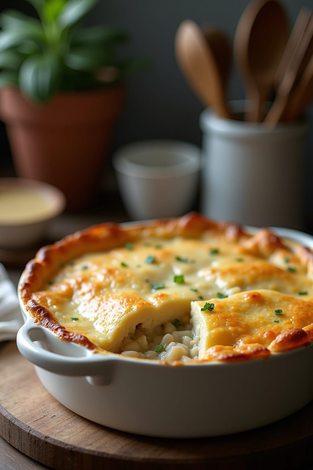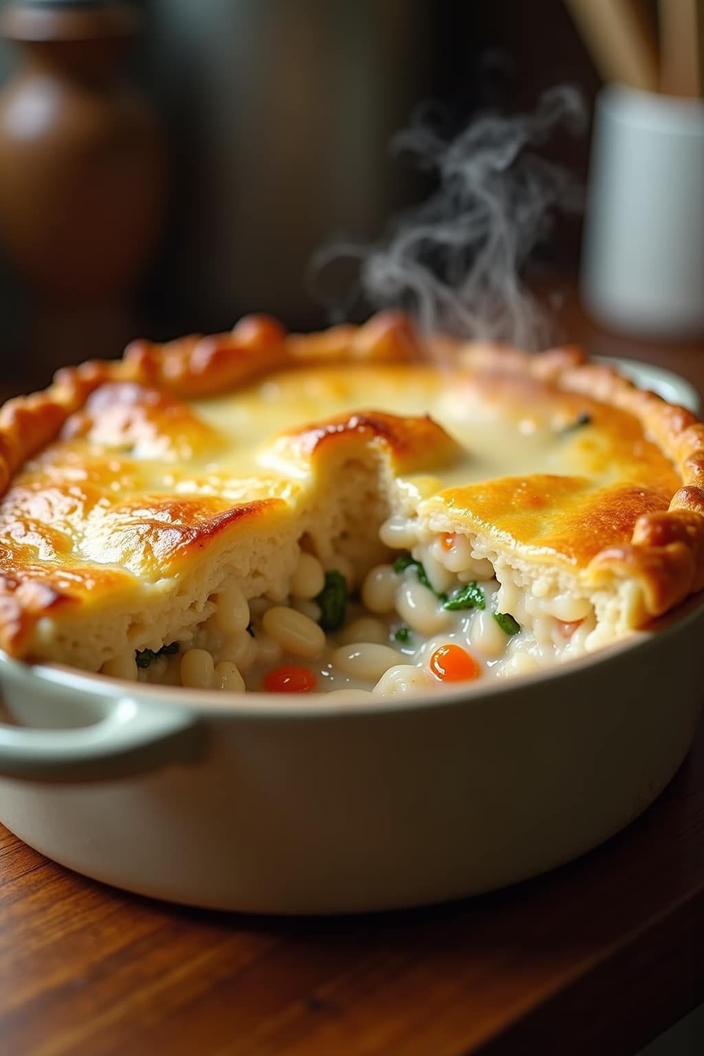 The Creamy Garlic Parmesan Chicken Pot Pie Casserole elevates the classic comfort dish with rich, indulgent flavors that will satisfy even the most discerning palates. This gourmet variation incorporates a velvety garlic parmesan sauce that coats tender chunks of chicken and vegetables in a heavenly blanket of flavor. Fresh garlic cloves are sautéed to golden perfection before being combined with heavy cream, chicken broth, and a generous helping of freshly grated Parmesan cheese to create a sauce that’s both sophisticated and deeply satisfying. The addition of Italian herbs like thyme and oregano complements the garlic and cheese beautifully, while a splash of white wine adds complexity and depth to the overall flavor profile. Rather than traditional pie crust, this recipe features a buttery, flaky puff pastry topping that turns golden brown and creates the perfect textural contrast to the creamy filling beneath. What makes this variation truly special is the balance between the sharp, nutty Parmesan, the aromatic garlic, and the comforting traditional elements of a chicken pot pie. Whether served for a family dinner or special occasion, this Creamy Garlic Parmesan Chicken Pot Pie Casserole transforms an everyday meal into a memorable dining experience.