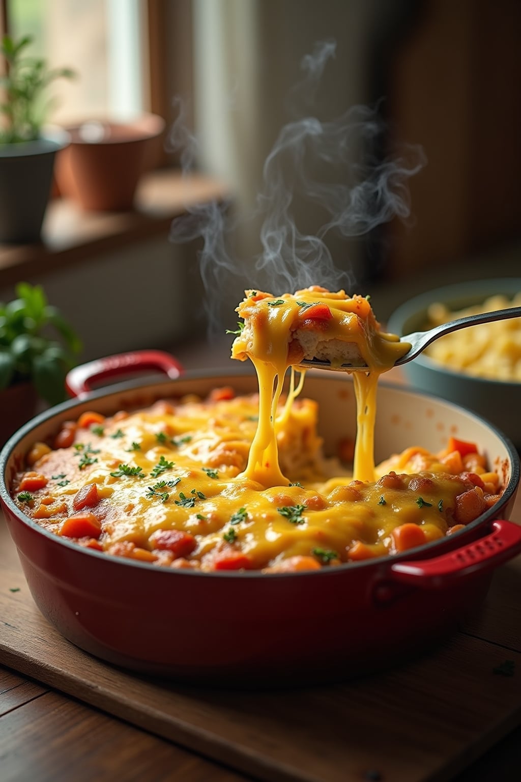 When you’re craving the ultimate comfort food but don’t want to deal with a sink full of dishes, this one-pot cheesy chicken pot pie casserole is your answer. The beauty of this recipe lies in its simplicity – everything cooks in a single pot, from sautéing the aromatics to creating that luscious, cheese-infused sauce that takes traditional pot pie to new heights. You’ll love how the gooey cheese melts into every bite, creating a decadent twist on a classic favorite that your whole family will request again and again. This time-saving version skips the separate crust preparation but doesn’t sacrifice any of the familiar flavors you adore in traditional chicken pot pie. Whether you’re a busy parent needing a quick weeknight dinner solution or someone looking to impress guests without spending hours in the kitchen, this recipe delivers restaurant-quality results with minimal effort. The combination of tender chicken chunks, colorful vegetables, and that irresistible cheesy sauce creates a mouthwatering meal that somehow tastes even better as leftovers the next day. Best of all, you can customize this versatile dish to suit your preferences while still maintaining that perfect balance of creamy comfort and satisfying heartiness that makes chicken pot pie casseroles so beloved.