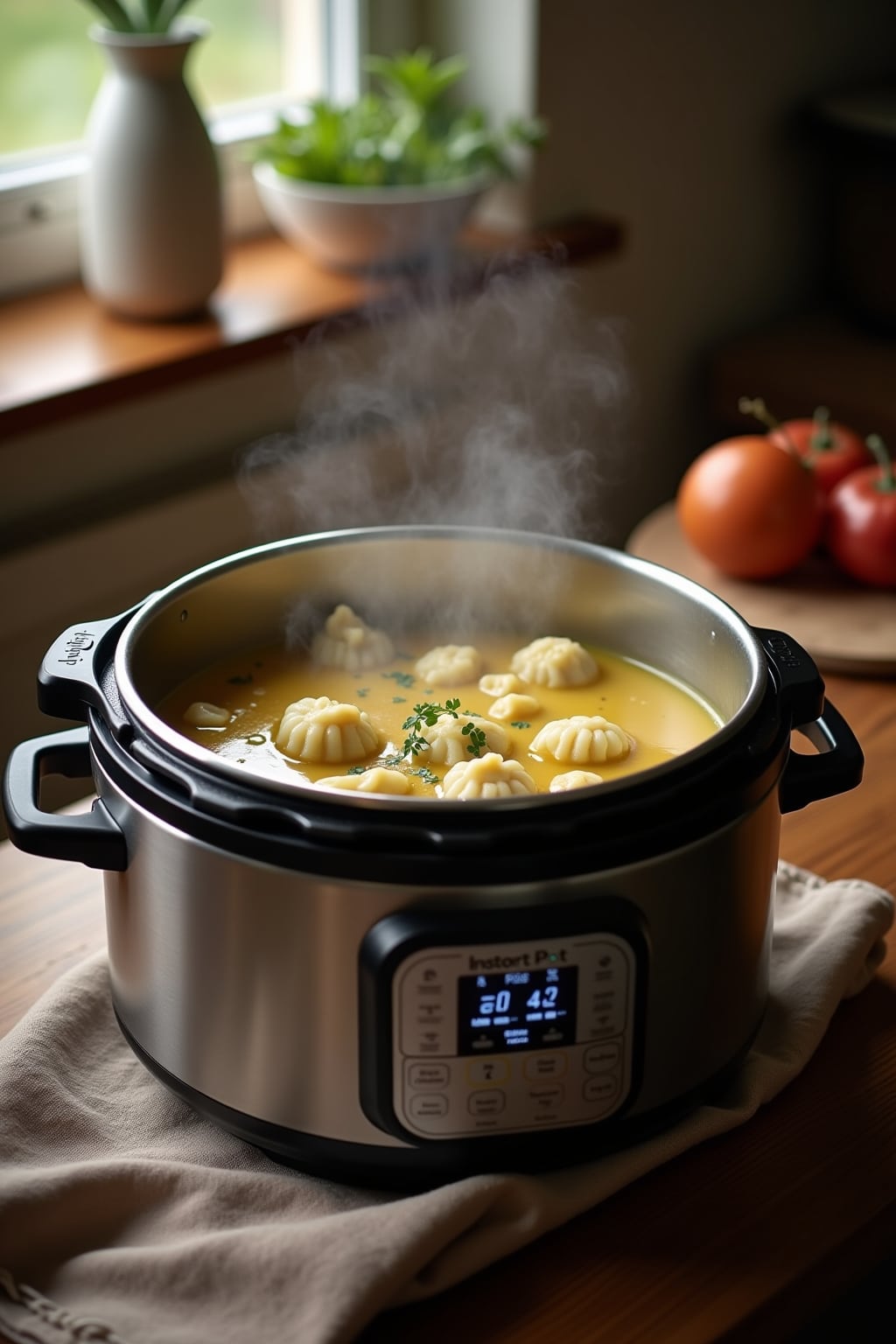• Natural pressure release creates ideal texture for both potatoes and dumplings