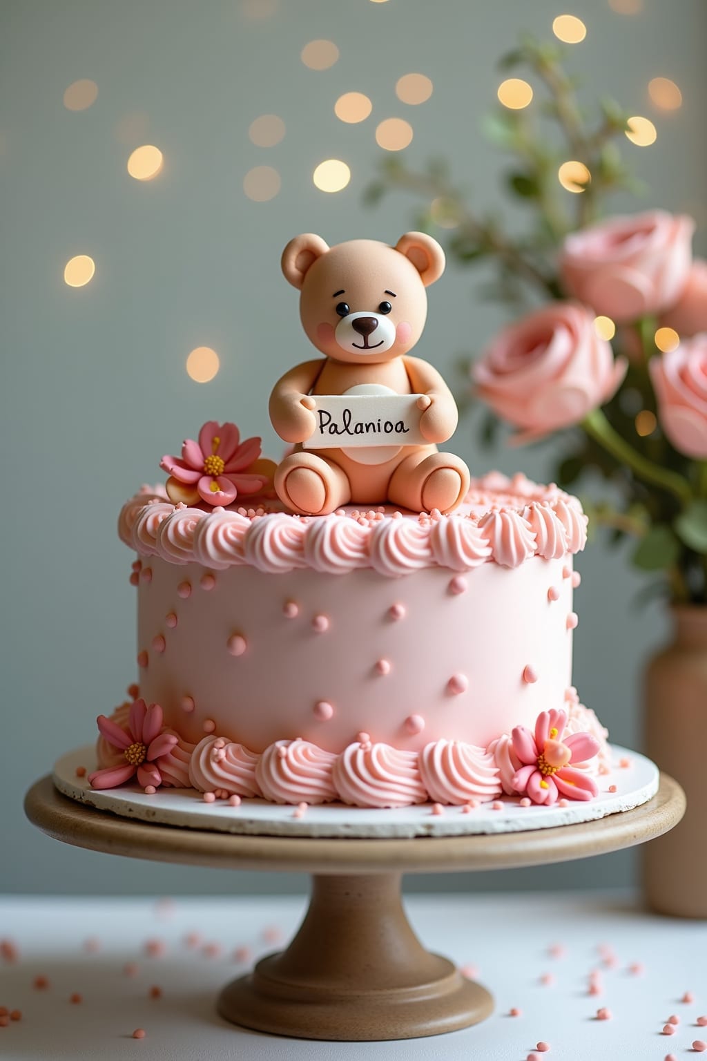 10. Teddy bear cake with piped fur texture and a fondant bowtie or flower crown