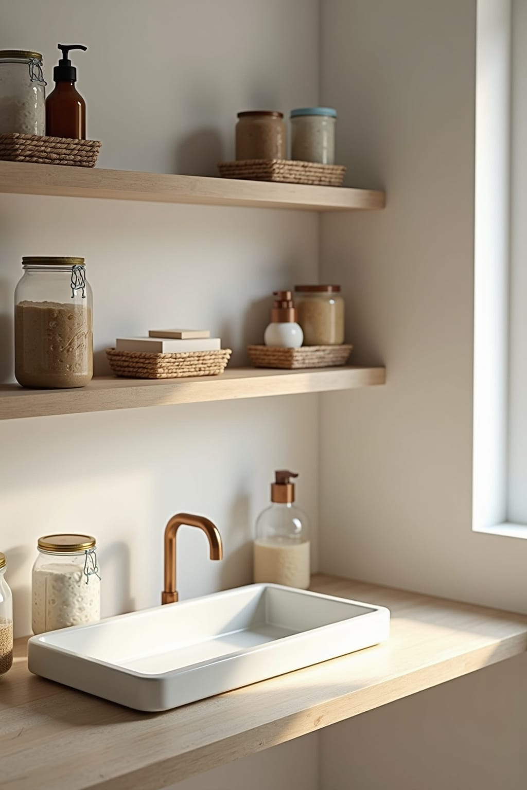 1. Install floating shelves for both storage and display of decorative items like candles and small plants.