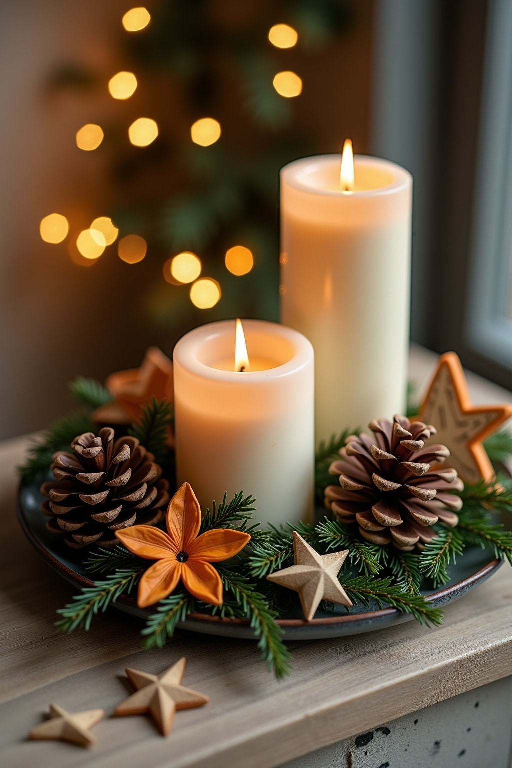 2. Tannenzapfen mit natürlichen Wachskerzen als Tischdekoration