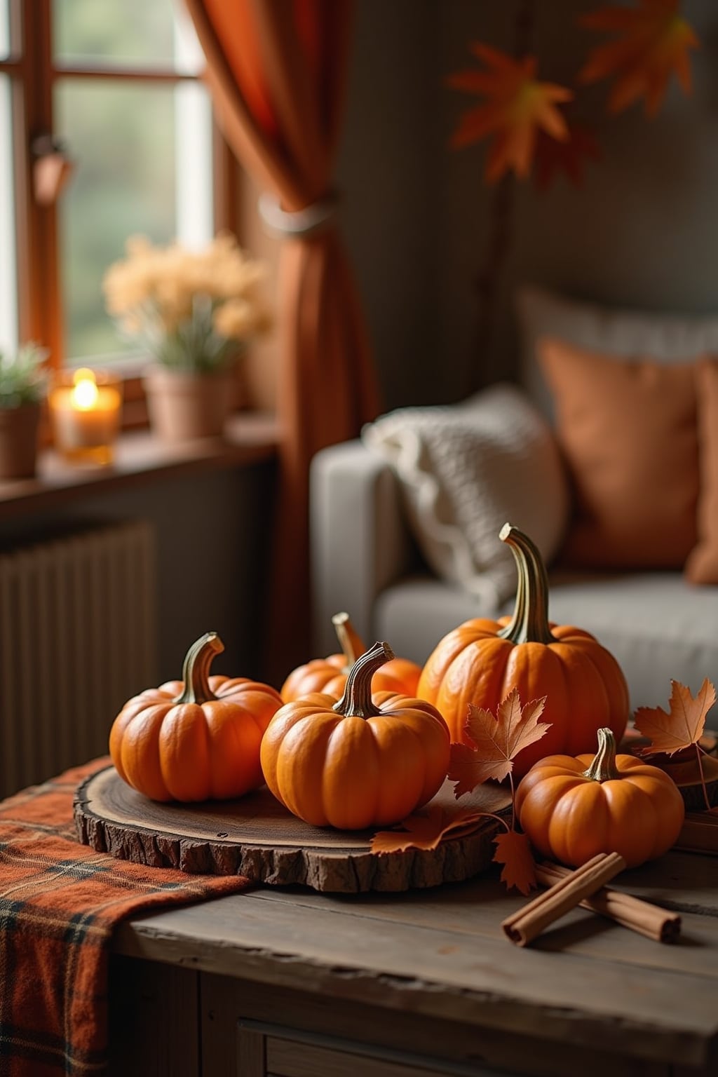 7. Duftkerzen mit Herbstaromen auf rustikalen Holzscheiben arrangiert