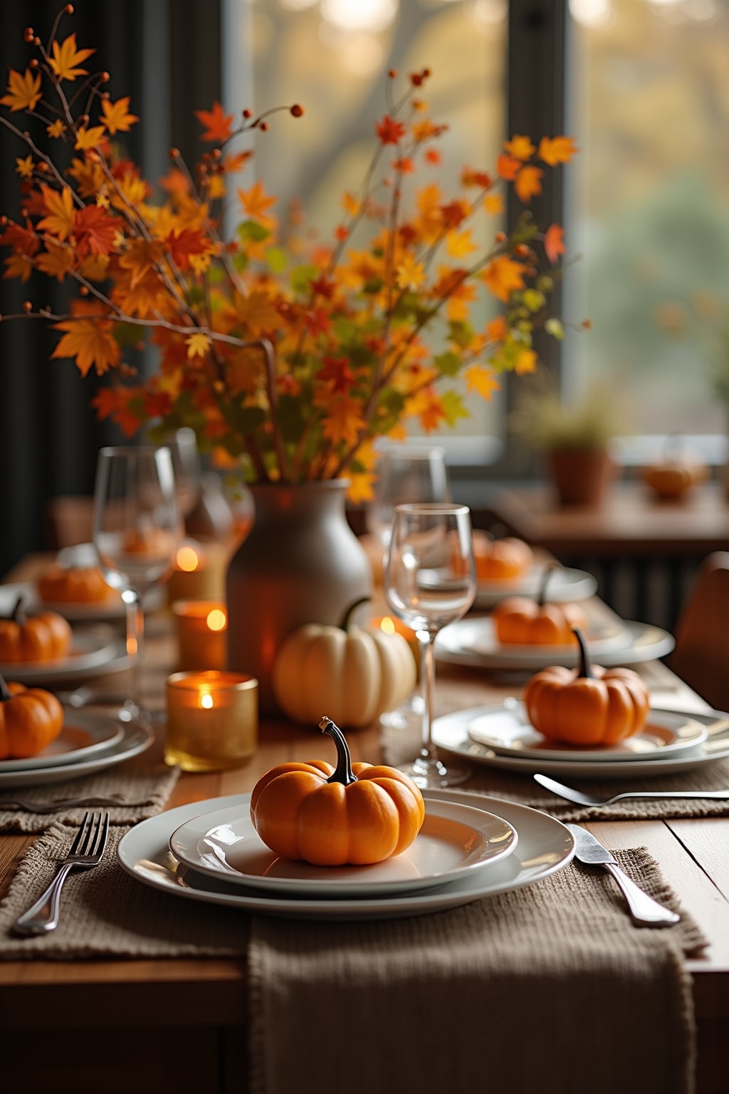 2. Tischdekoration mit kleinen Kürbissen, Kastanien und Teelichtern