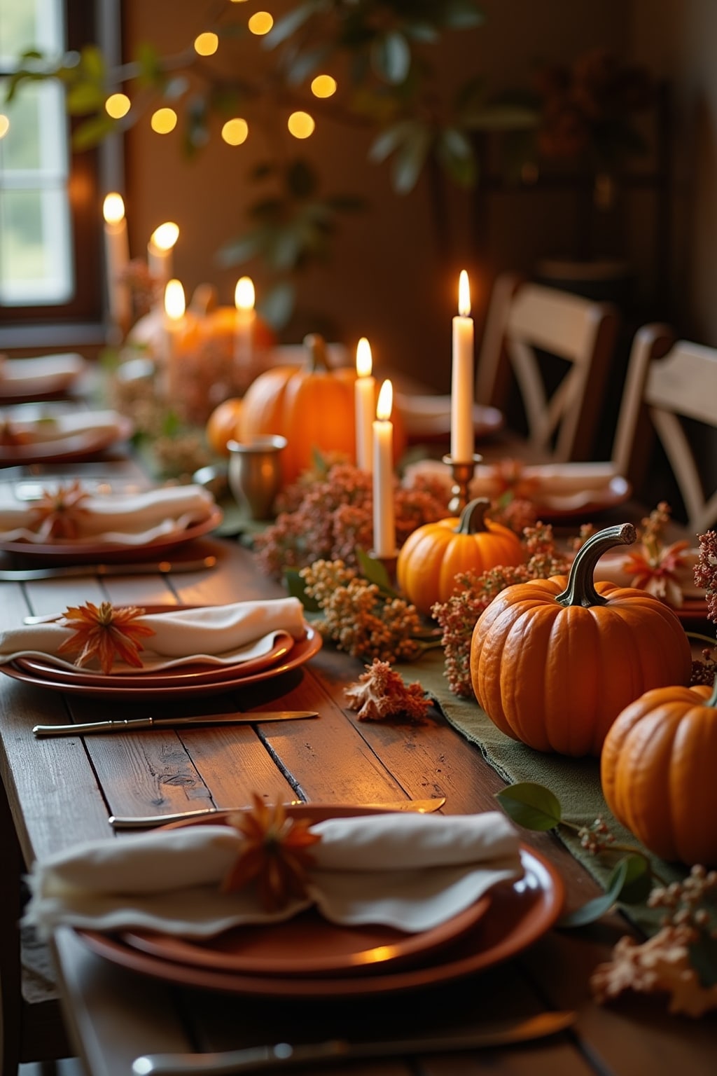 10. Lange Tafelkerzen in kupfer- oder goldfarbenen Kerzenhaltern für festliche Herbstabende