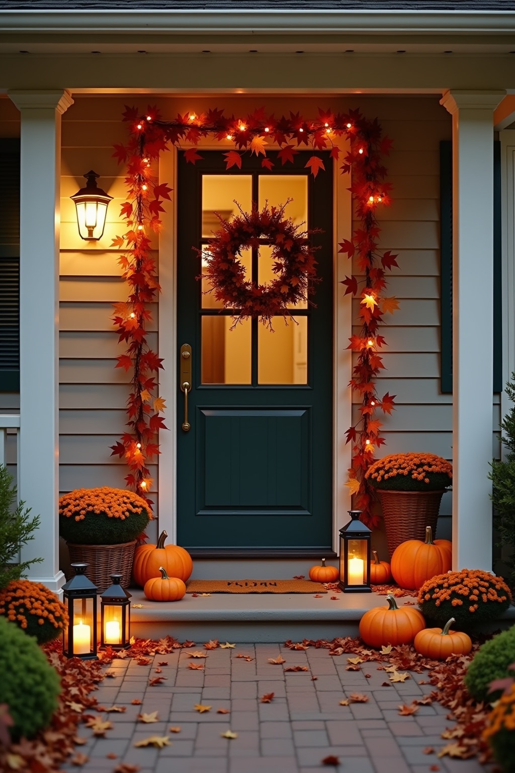 8. Metallene Laternen mit Herbstdekorationen umkränzt für den Eingangsbereich