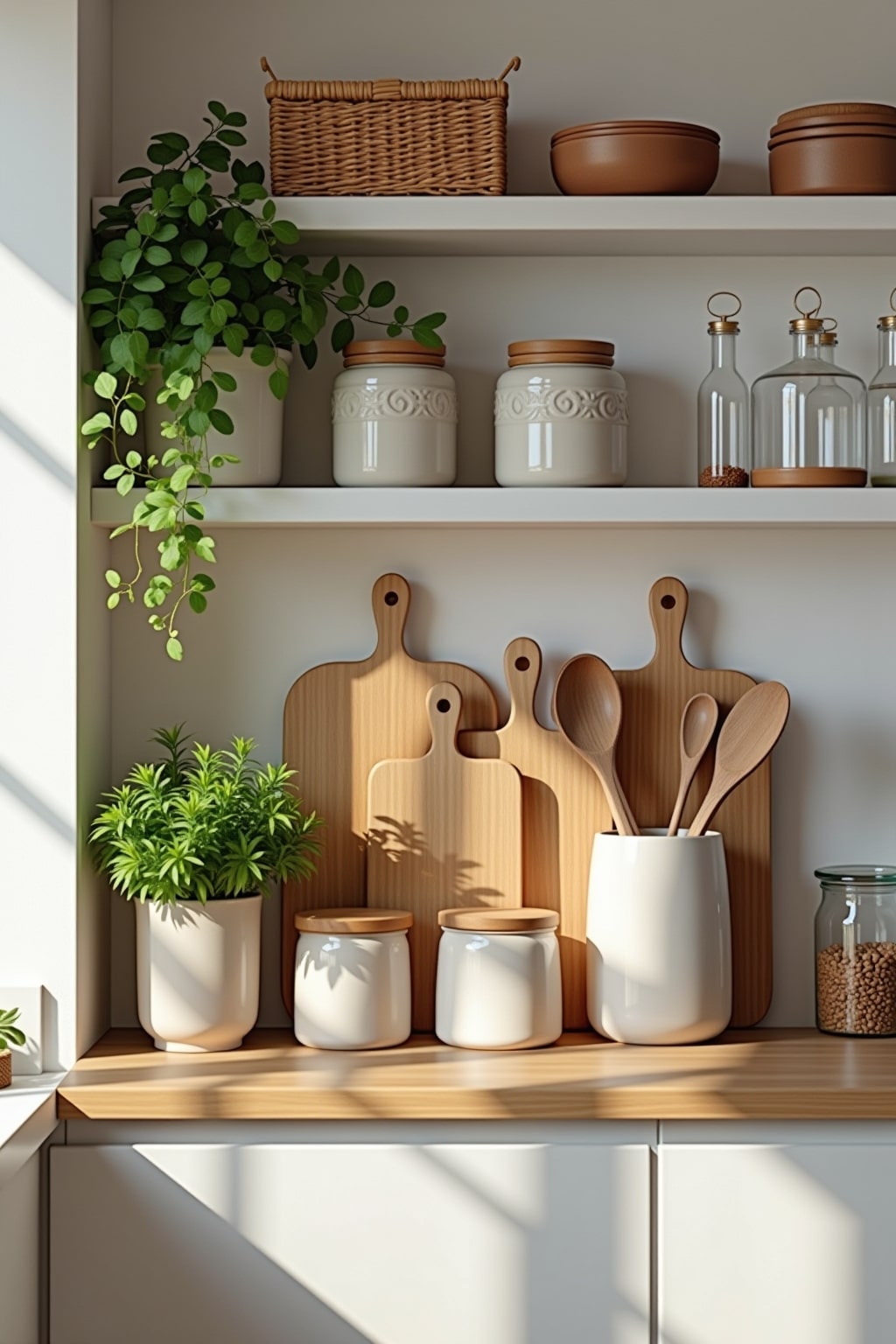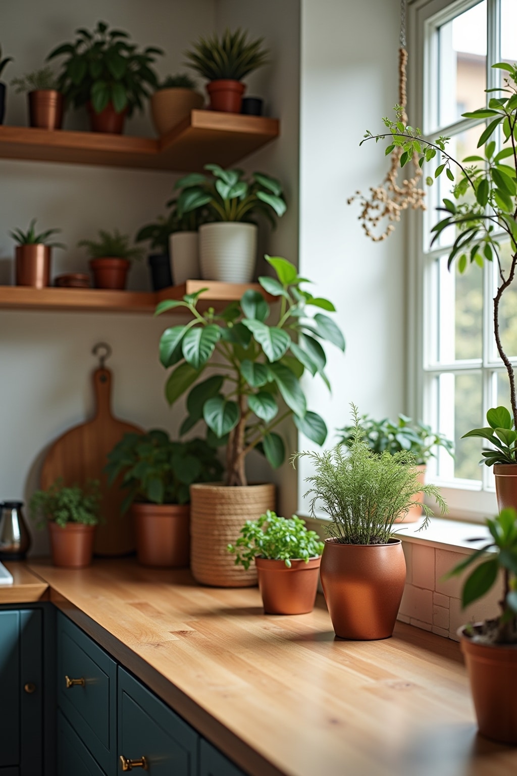 7. Urbaner Jungle mit Grüntönen – Kräutertöpfe, grüne Glasflaschen und naturbelassene Holzaccessoires