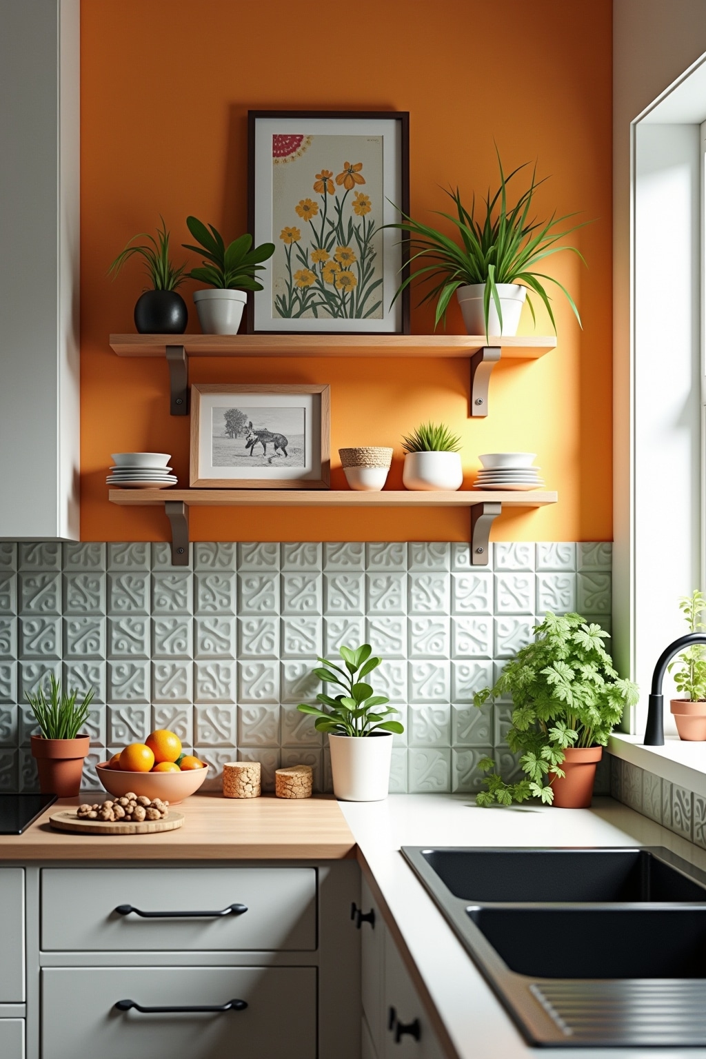 9. Gemütliches Rot-Orange – Ziegel-Wanddeko, orangefarbene Topfuntersetzer und rote Küchenhelfer