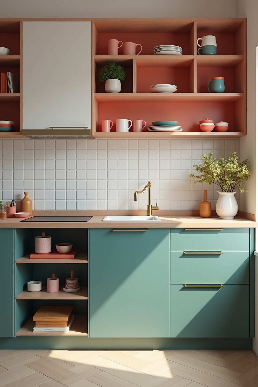 1. Akzentwand mit kräftiger Farbe, die einen spannenden Kontrast zu hellen Küchenmöbeln bildet