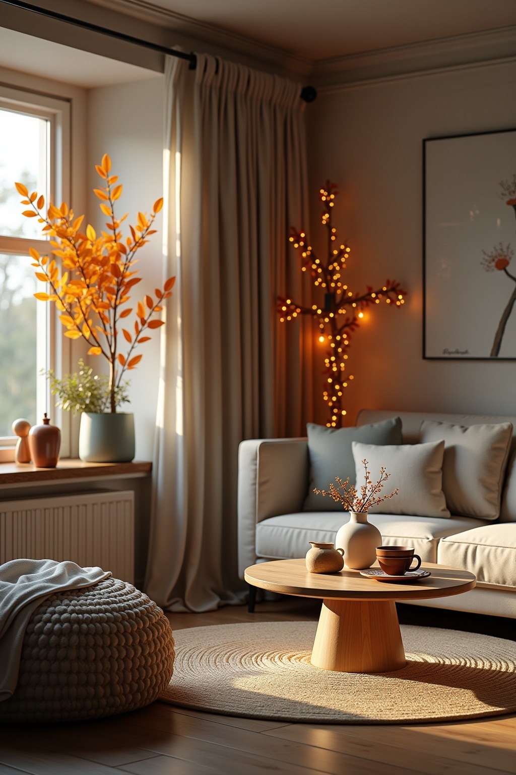 4. Wintergemütlichkeit: Flauschige Plaids in Cremeweiß oder Dunkelrot, Lichterketten und Kerzen für warmes Licht, Tannenzapfen in Glasschalen, festliche Kissen mit metallischen Akzenten
