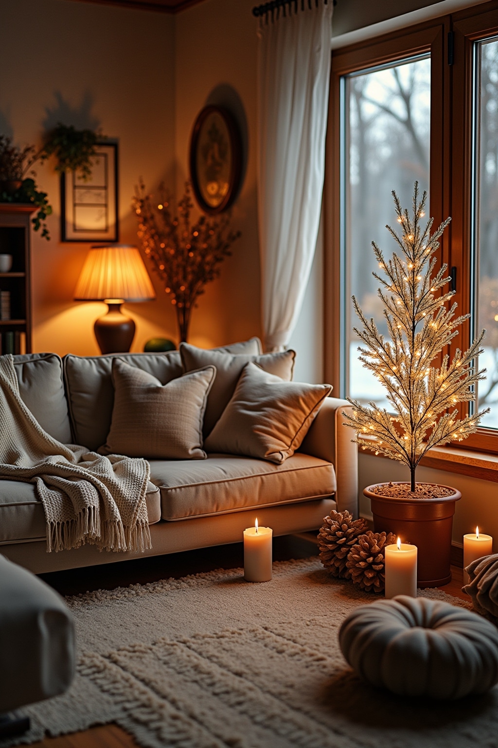 4. Winter: Kuschelige Wolldecken, Lichterketten und festliche Dekoelemente in Silber und Gold