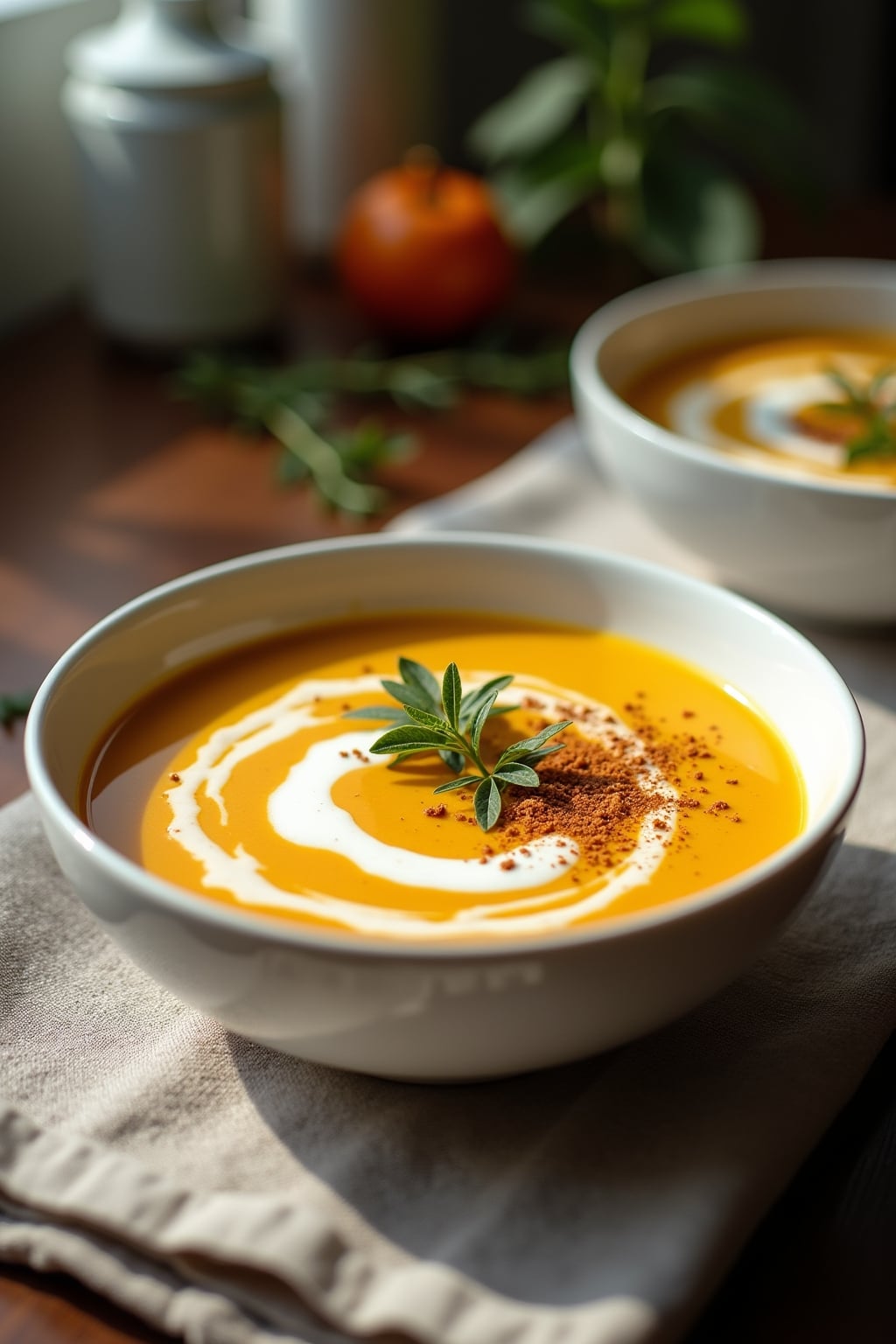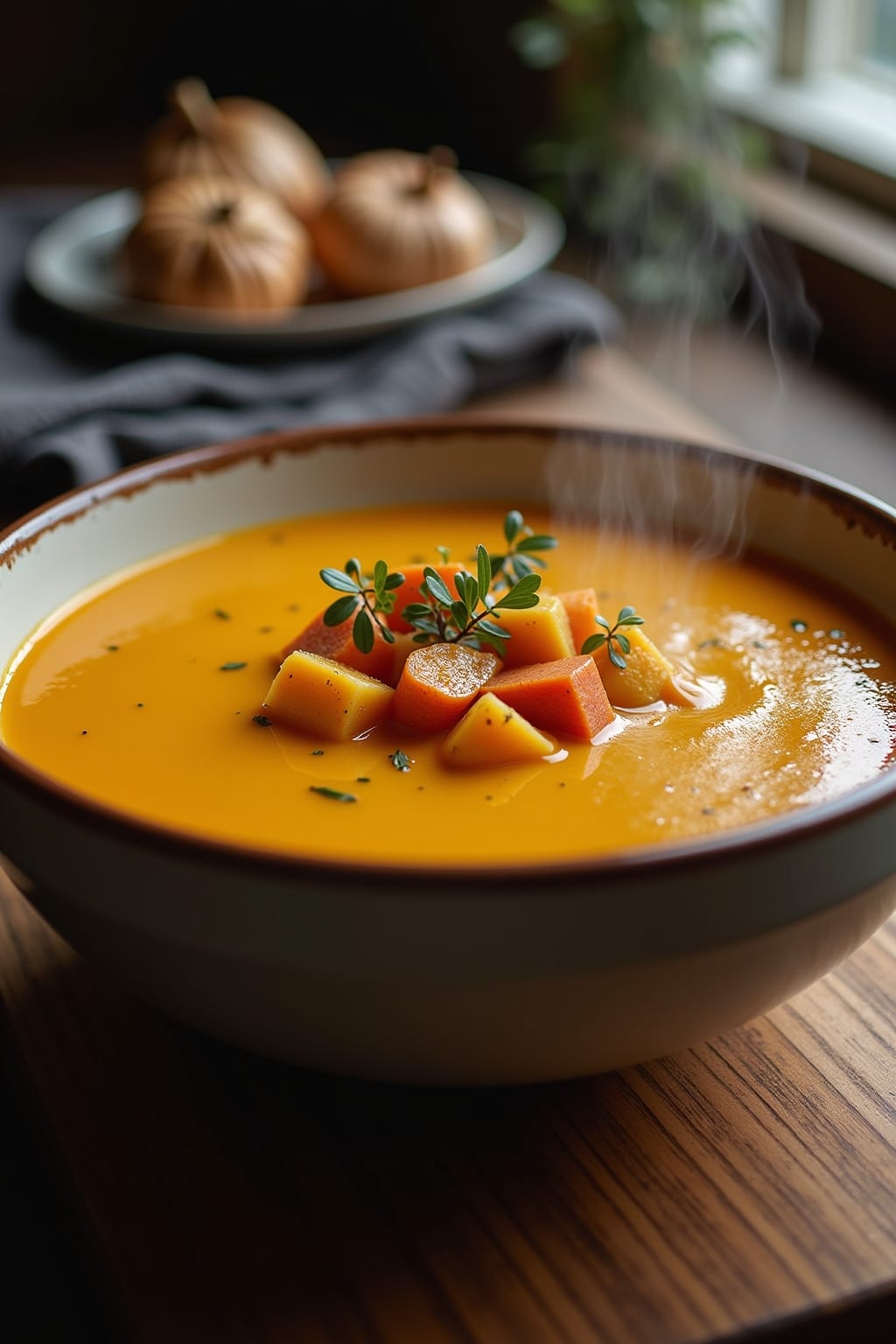 This vibrant Thai-inspired soup brings together the natural sweetness of butternut squash and carrots with the bold flavors of Southeast Asian cuisine. Fresh lemongrass, galangal, and makrut lime leaves create an aromatic foundation that transforms ordinary vegetables into something extraordinary. Red curry paste and bird’s eye chilies provide a customizable heat level that awakens the palate without overwhelming the dish’s subtle complexity. Creamy coconut milk balances the spice while adding richness that makes this soup satisfying enough for a main course. A splash of lime juice brightens everything with necessary acidity, cutting through the natural sweetness of the roasted vegetables. Fresh cilantro and Thai basil add herbaceous notes that elevate this soup beyond ordinary purées. The beauty of this recipe lies in its adaptability—you can adjust the spice level, herb combinations, and garnishes to suit your personal taste while still creating a memorable dish in under 30 minutes.