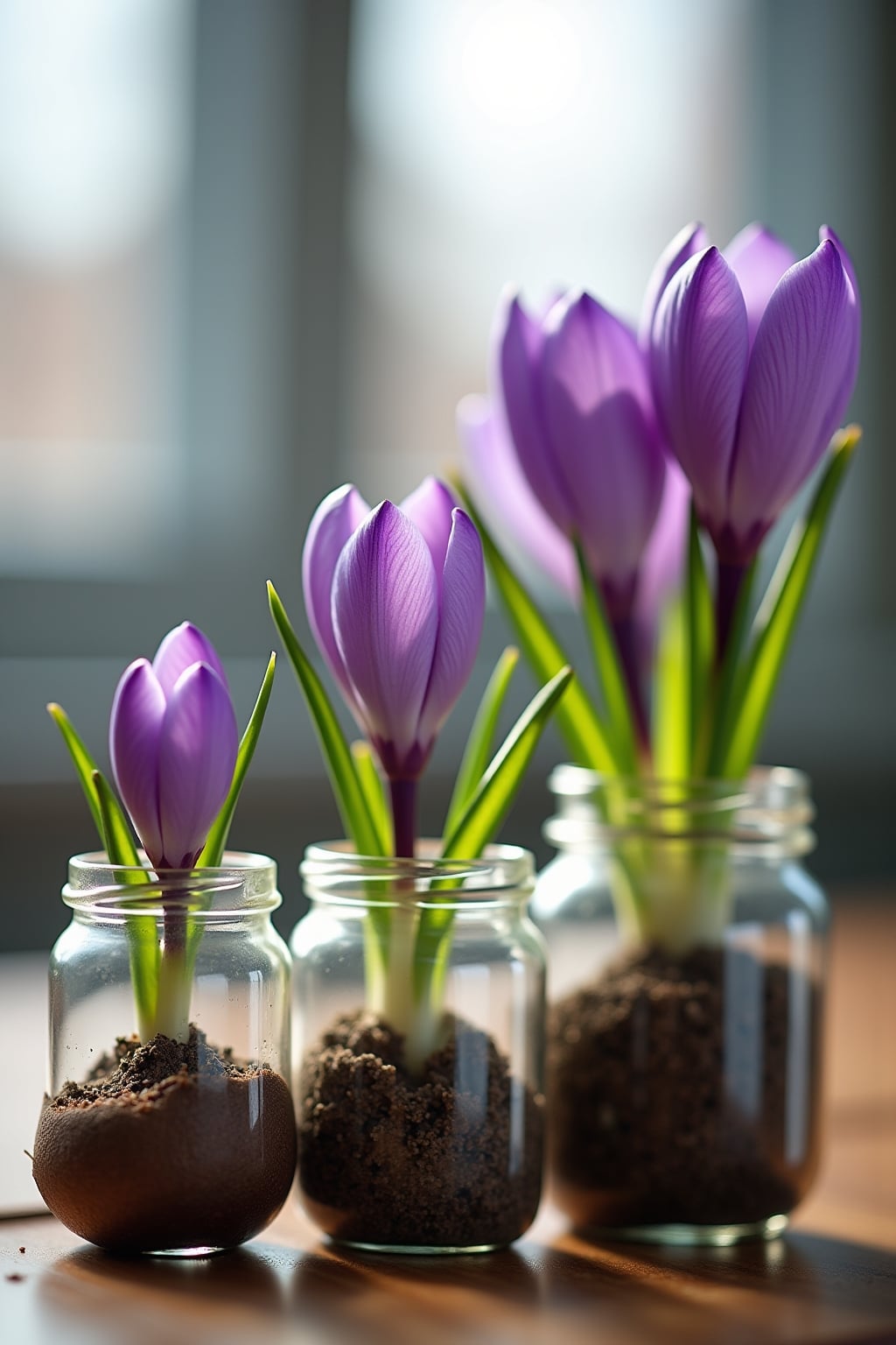 11. Bepflanzte Glasvasen mit sichtbaren Krokuszwiebeln