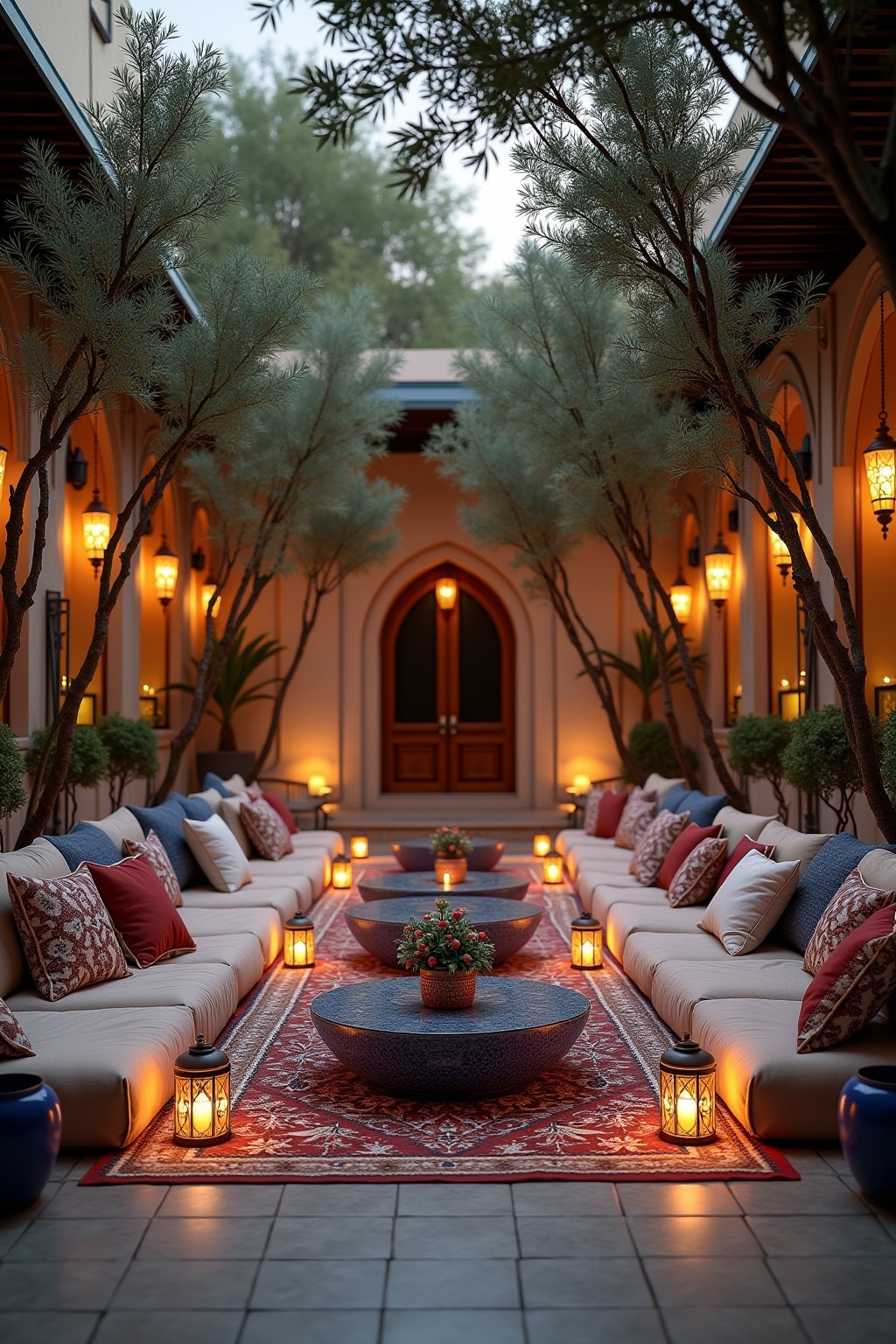 – Niedrige Holz- oder Messingtische für Tee und Snacks