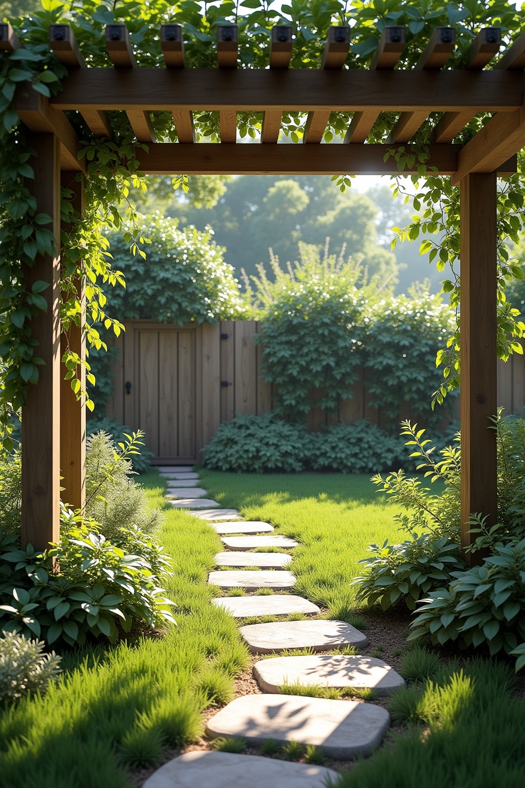 9. Pergola mit Kletterpflanzen und integrierten Lichterketten