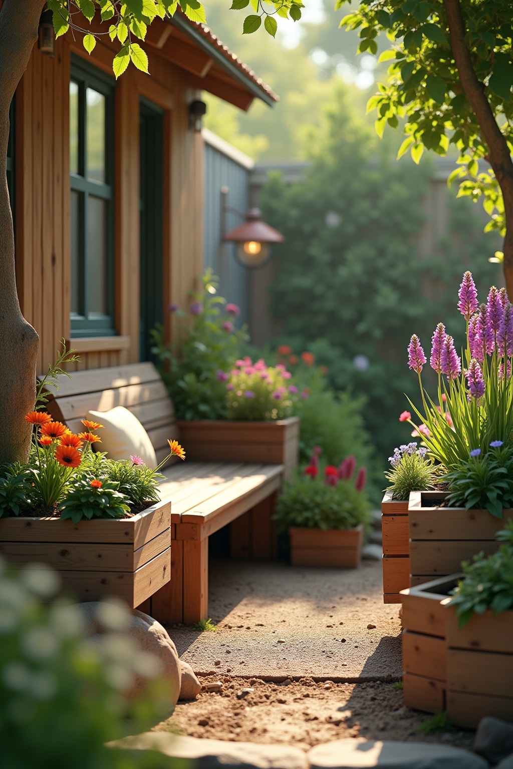 1. Selbstgebaute Holzbank mit integrierten Blumenkästen