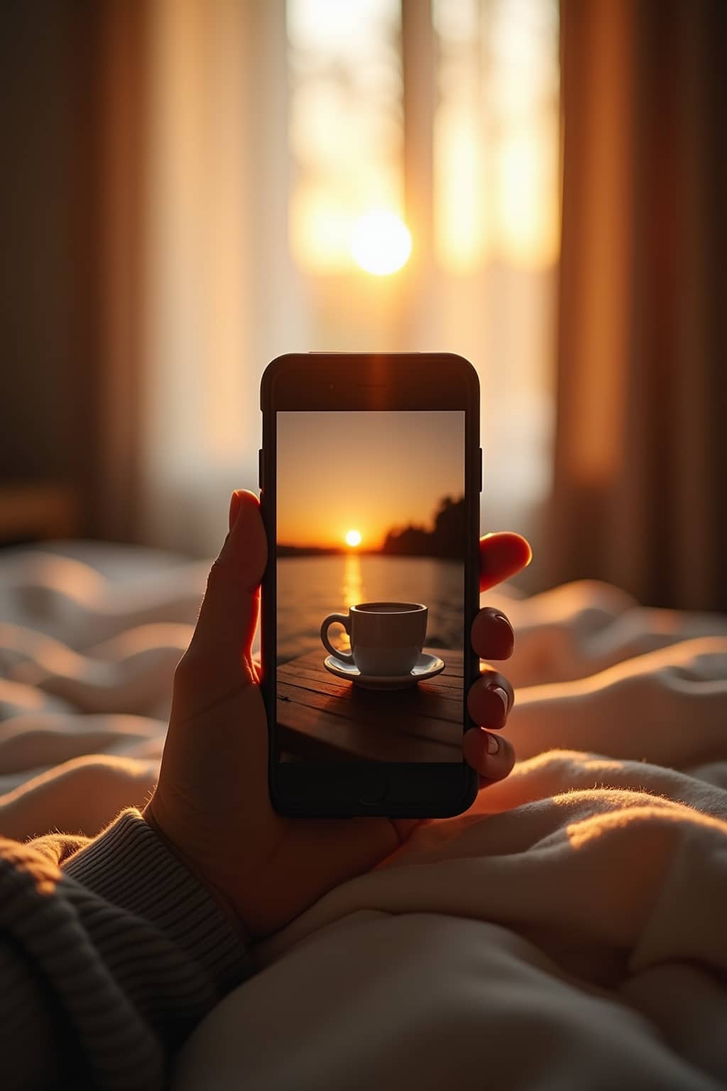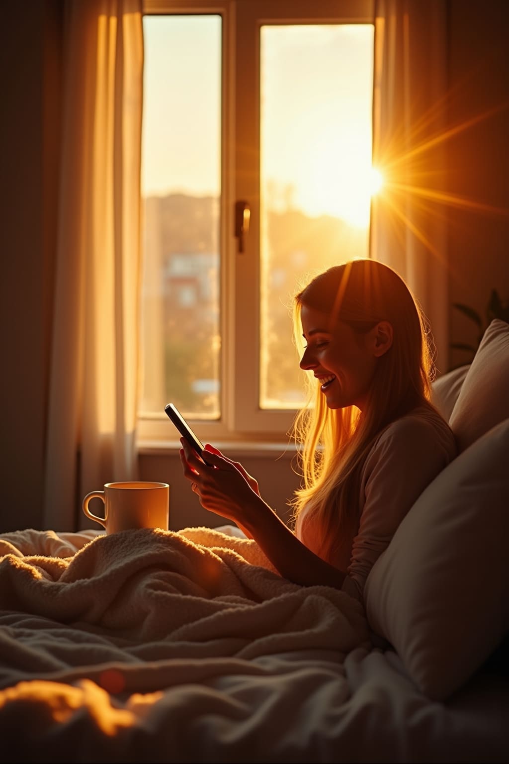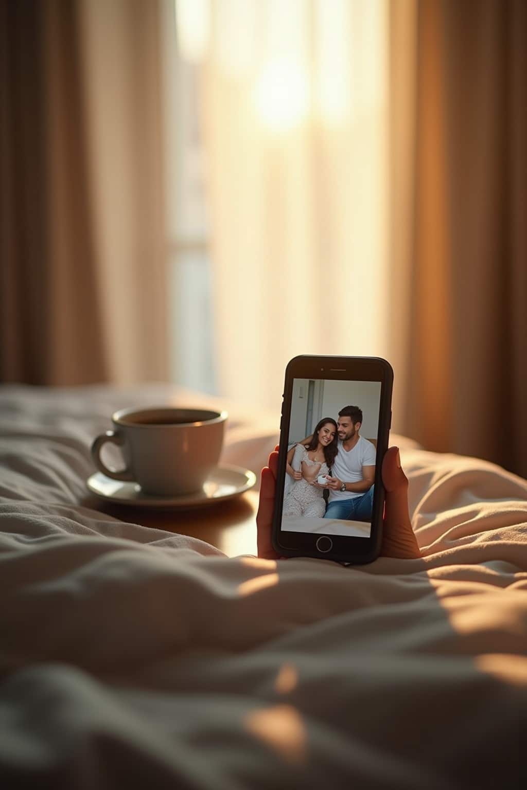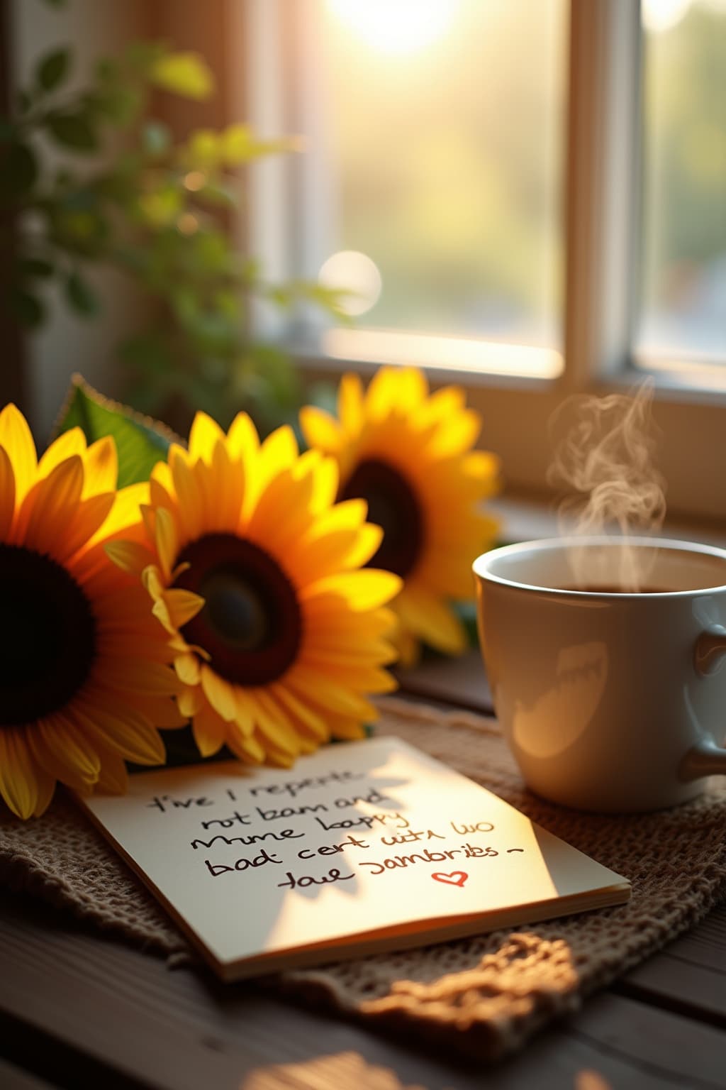 3. A steaming coffee cup beside an open window for cozy, intimate messages