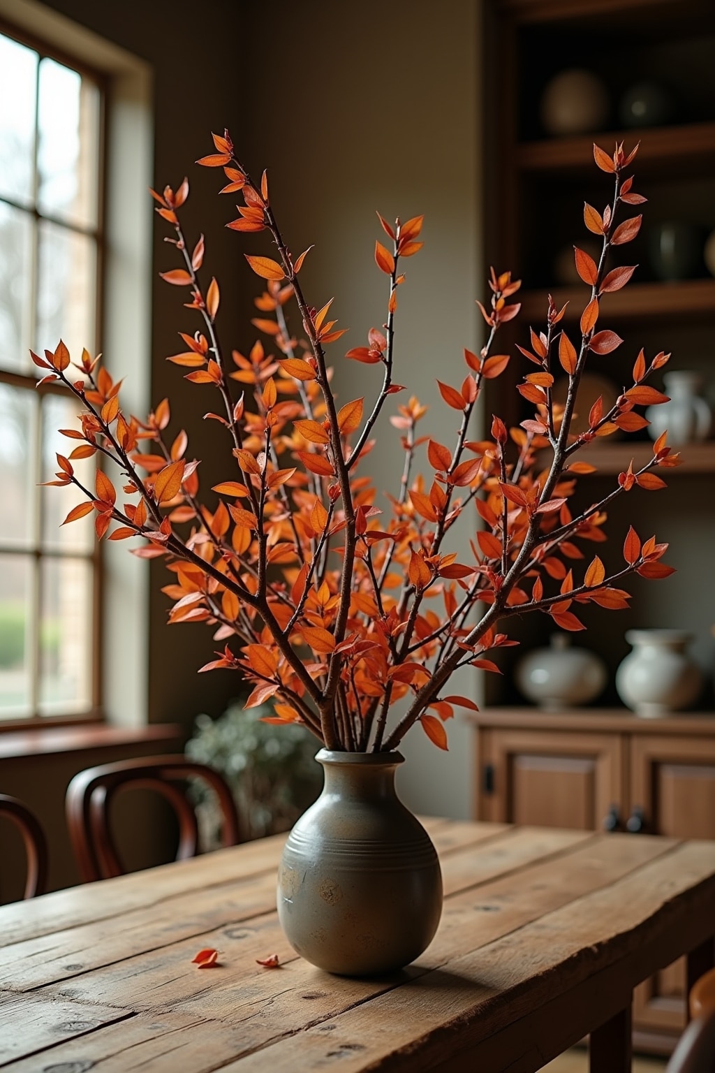 2. Dekorativer Zweig in einer schlanken Vase als Blickfang auf dem Esstisch